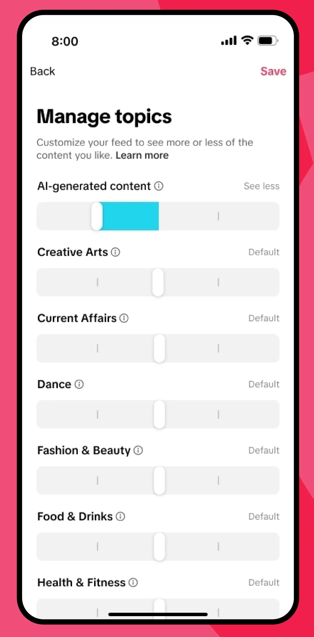 [亿邦原创]日前,在都柏林举行的年度欧洲信任与安全论坛上,TikTok宣布推出全新的AI生成内容调节功能。用户将可以通过“设置—内容偏好—话题管理”中的滑动条自主控制“ForYou”推荐流中看到AI生成内容的比例,和舞蹈、运动、美食饮料等内容类别的调整方式类似。