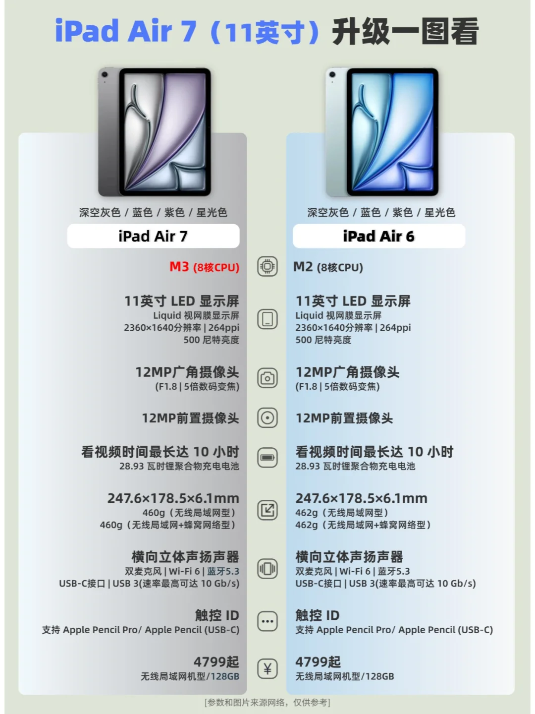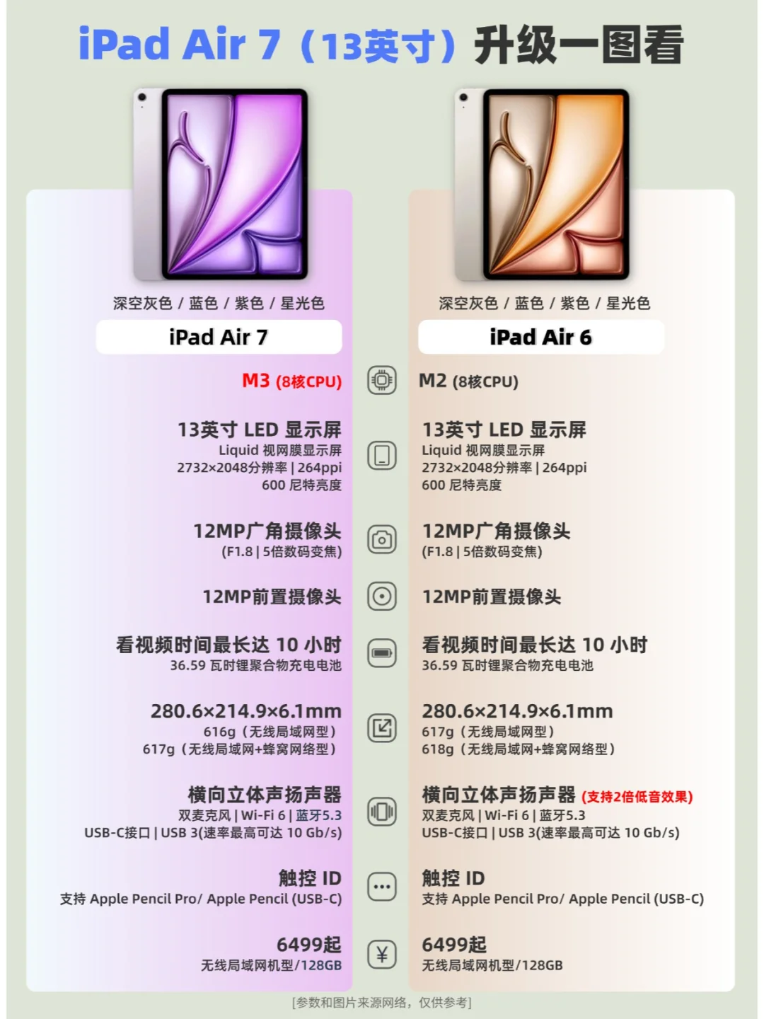 新款iPad11和iPad Air 7发布,终于可以仔细看看了。 📱iPad 11 就配置来看,iPad 11,也就是2025款iPad(A16)的升级点主要包括: ▪️128GB内存起步(很难想象,苹果64GB时代终于宣告结束); ▪️A16芯片(但是5核CPU和4核GPU,相较iPhone15的A16性能略有缩减); ▪️支持 Smart HDR 4 技术(能够拍摄出更加细腻和生动的照片); ▪️升级至蓝牙5.3 当然,新款iPad11依然不支持Apple Intelligence,整体来看刀法依然精湛。 📱iPad Air 7 iPad Air 7,也就是2025款iPad Air(M3)的升级点主要包括: ▪️M3芯片,多核 CPU 性能比上一代 M2 芯片提升了约 18%。 另外, 13英寸的M3款iPad AIr取消了扬声器“2 倍低音效果”特性,目前仅在上一代 M2 iPad Air 中才引入。 这…… 对于新款iPad,你怎么看呢? 数码 平板 平板电脑 ipad iPad ipad11 ipadair ipadair7 国补 数码大玩家