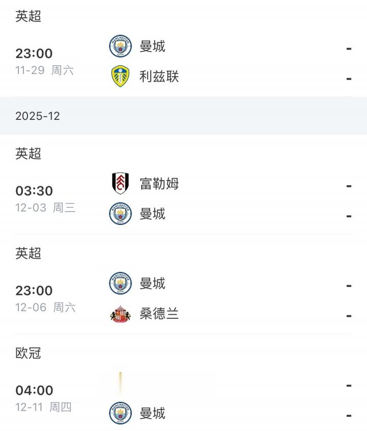 曼城之后3场比赛要在联赛先后面对利兹联、富勒姆和桑德兰,然后在下一轮欧冠面对皇马。