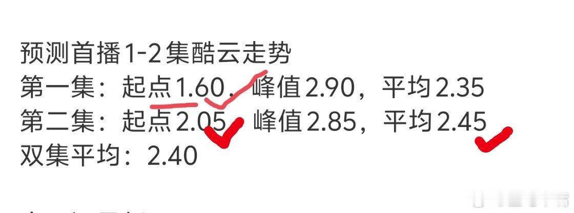 陈晓 孙千 罗一舟《大生意人》首播收视快报,峰值3.2155,平均2.5204首播很不错!双集酷云走势如下:第一集:起点1.6484,峰值3.2155,平均2.6080第二集:起点2.1295,峰值2.7192,平均2.4282双集平均:2.5204CVB估值:2.5204×0.82=2.066第一集预测低了,导致平均预测错了,其实第二集预测是差不多的