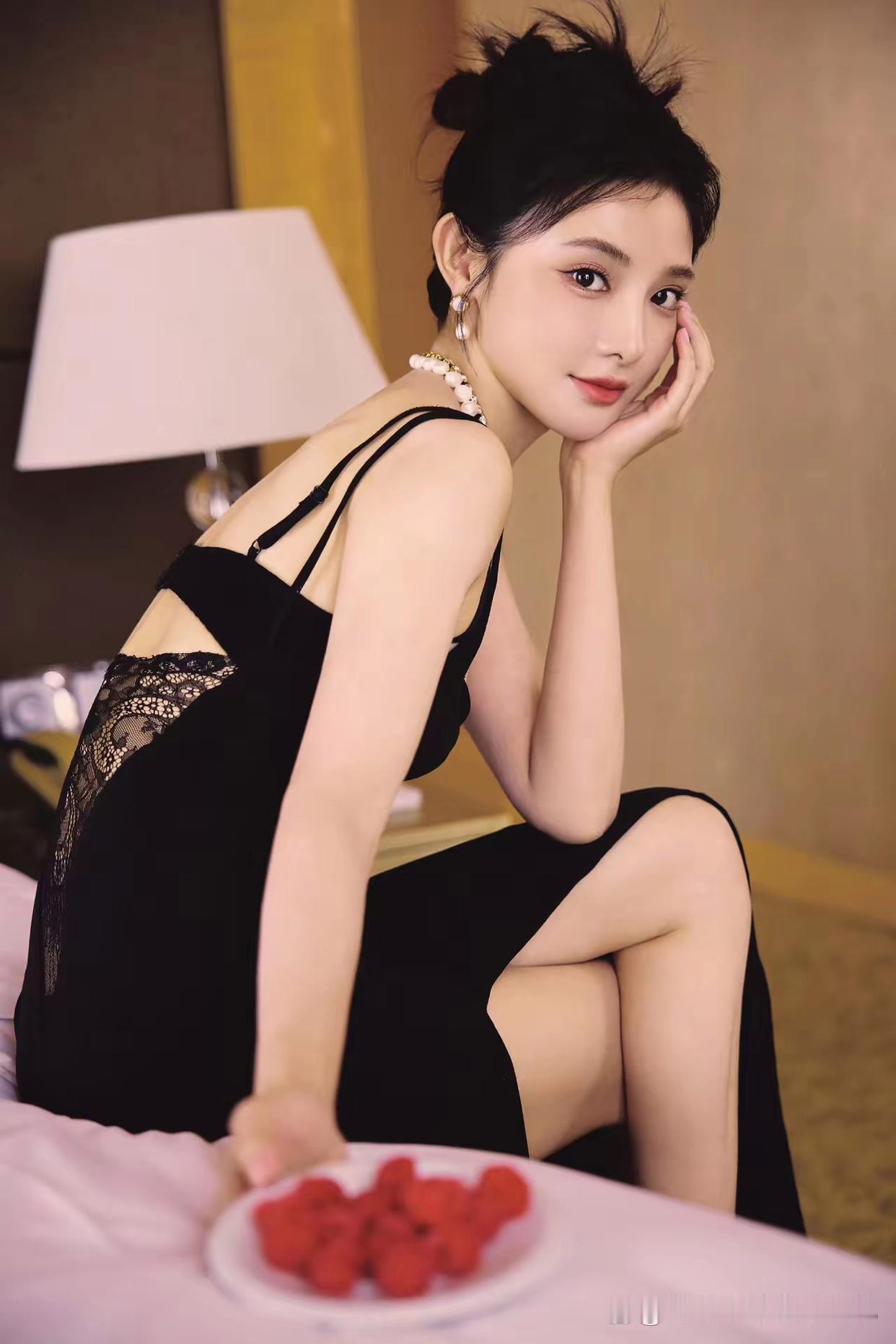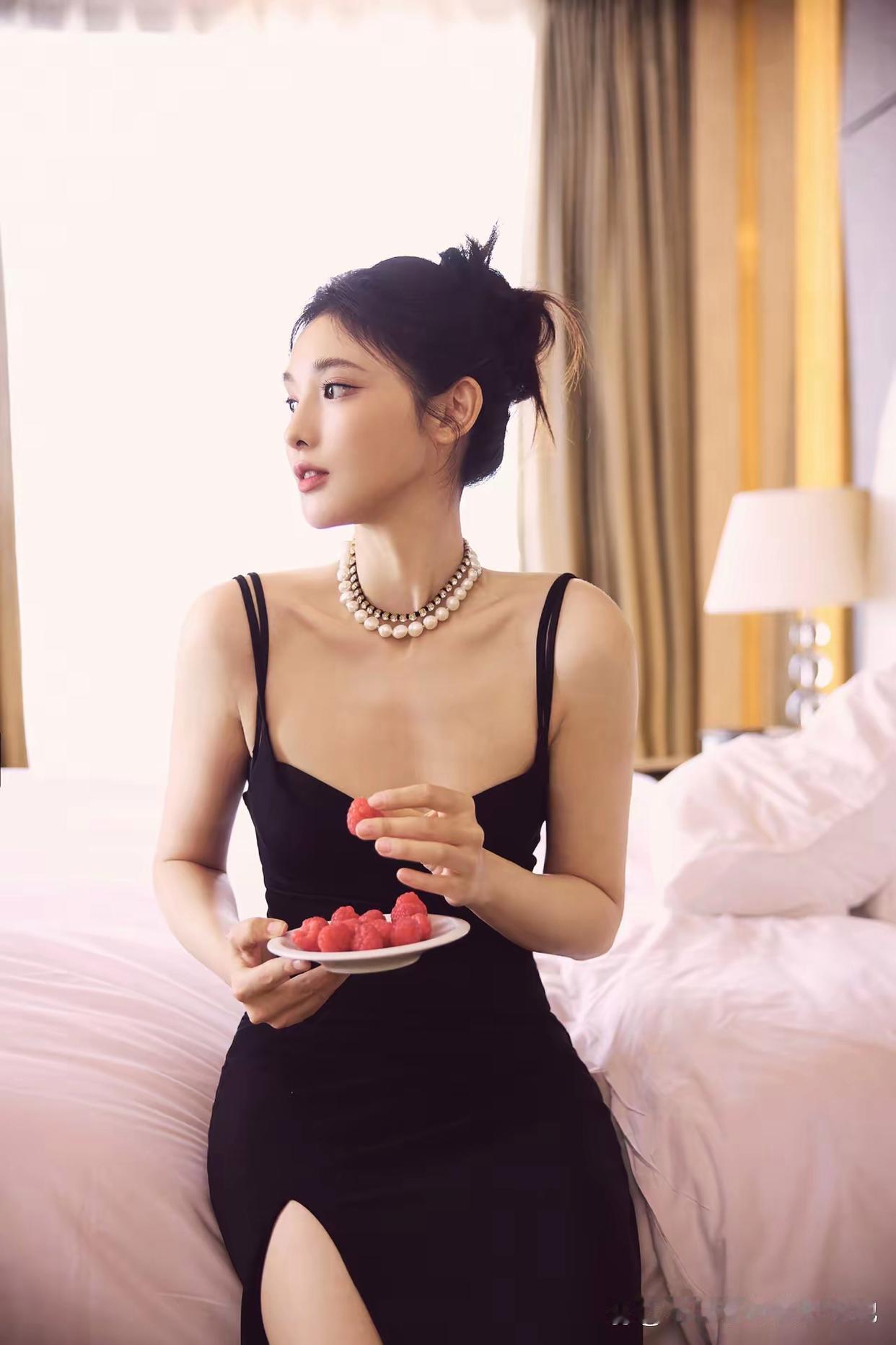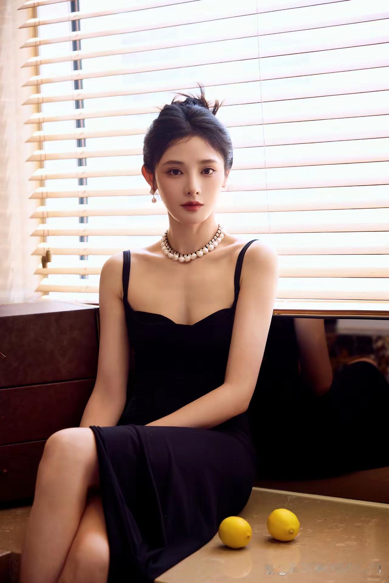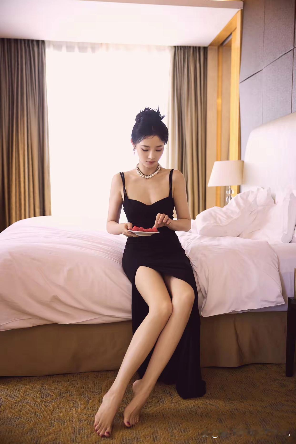 优雅黑裙,珍珠项链,床边小憩,尽显迷人魅力。彭小苒!!!