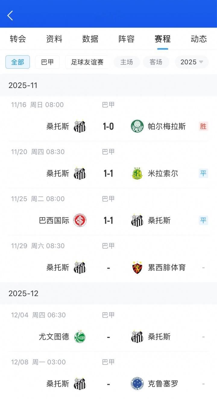 桑托斯目前还在降级区,本赛季巴甲还有三场比赛未踢。