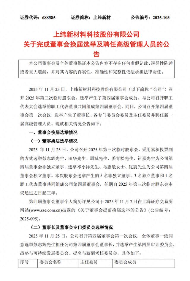 11月25日,上纬新材发布公告称,公司当日召开第三次临时股东会,选举产生了第四届董事会成员。同日,第四届董事会召开第一次会议,选举彭志辉为第四届董事会董事长,任期至第四届董事会任期届满之日止。