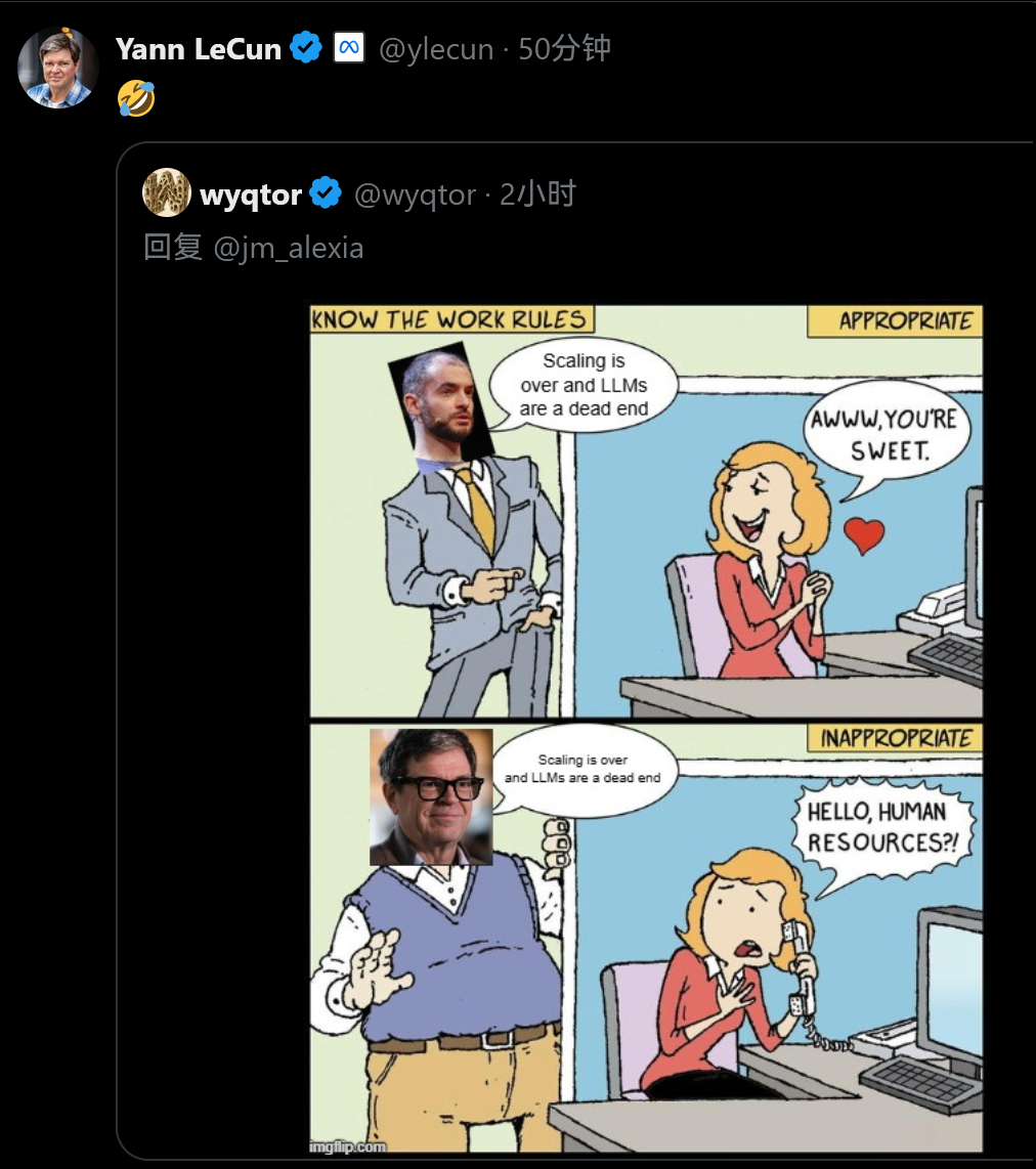 Ilya Sutskever: 我们不再处于规模化时代( age of scaling ),我们又回到了研究时代 (age of research)。这是Ilya Sutskever在和Dwarkesh Patel的一期访谈节目中表达的观点。以及图2是人们做的梗图,以及图3是梗图还被杨立昆本人给转发了。。---------------这段原文翻译是:从2012年到2020年,那是一个研究主导的时代。而现在,从2020年到2025年,我们进入了规模化时代——或许时间上略有出入,我们不妨给这些年份加上误差范围——因为人们不断强调:“这太惊人了,必须继续扩大规模,不断扩展。”一个关键词:规模化。但如今规模已经如此之大。人们真的相信,“虽然现在规模已经很大了,但如果你有100倍的资源,一切就会截然不同吗?”当然会有所不同。但是否真有人相信,只要把规模扩大100倍,一切就会彻底变革?我不认为这是真的。因此,我们再次回到了研究的时代,只不过这一次,我们拥有了强大的计算机。---------------采访全文很长,感兴趣的可以看原文:www.dwarkesh.com/p/ilya-sutskever-2