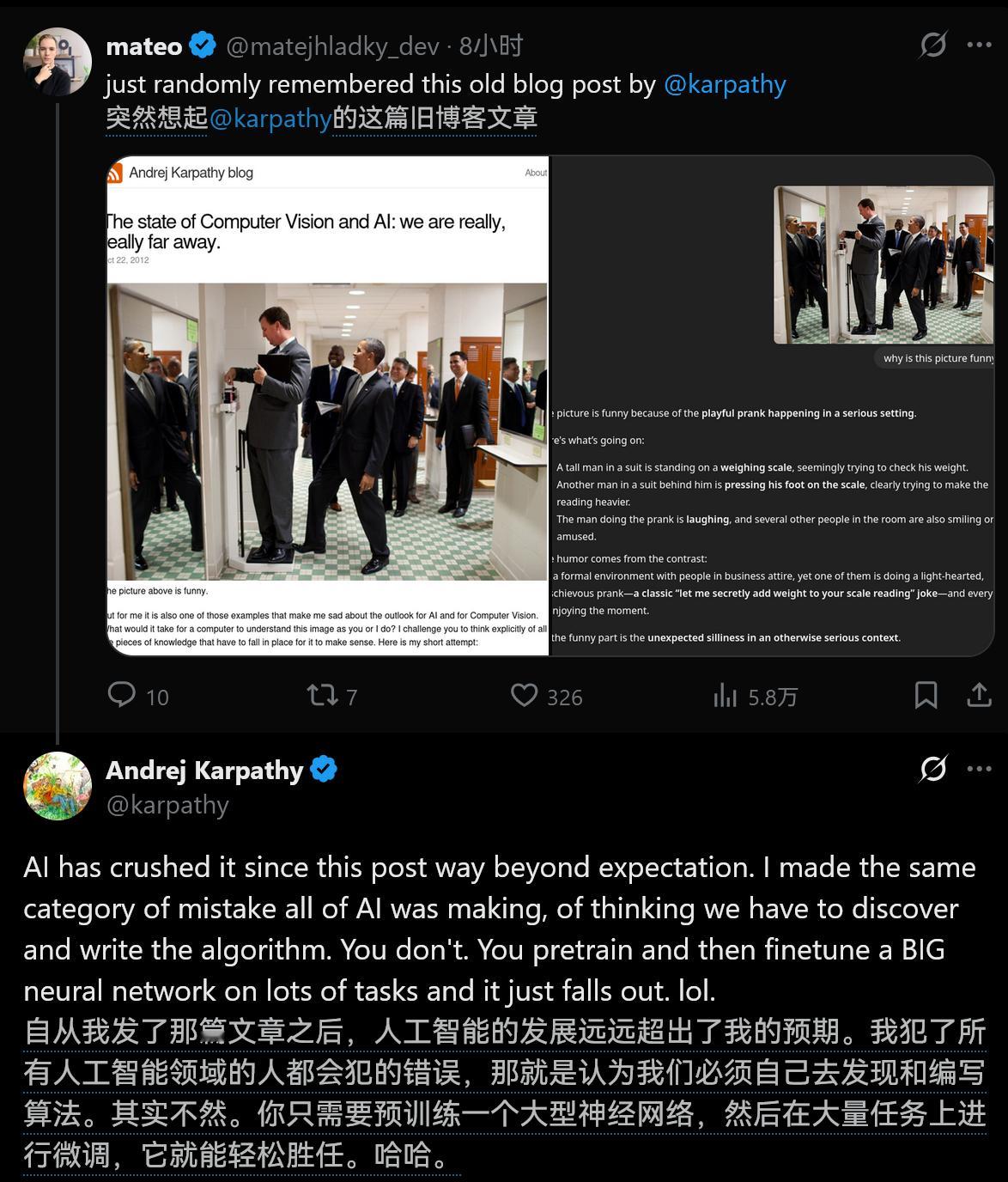 Andrej Karpathy:我犯了全天下AI研究者都会犯的错国外版的黑历史打脸bot翻出了AK 2012年的博客( karpathy.github.io/2012/10/22/state-of-computer-vision/ ),内容大概是图1这种图,让计算机理解其笑点在哪可太难了,几乎是不可能的。博文里列出了10个难点。但现在有些大模型已经可以理解了。AI的发展还是太快了。