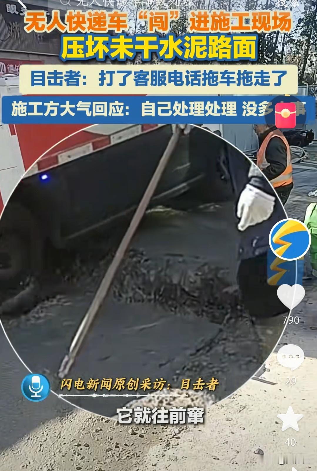 这无人快递车又“闯祸”了吧!施工队刚铺的水泥路面还没干,就留了个小门缝,这红家伙“嗖”一下就窜进去了,直接给新路面压出大印子! 工人师傅拿杆子拦都拦不住,最后只能打电话叫客服拖走。本来以为得扯皮,结果施工方挺大气:“没事,我们自己处理”。 这智能车是导航没更新施工区域吗?虽然场面有点好笑,但也得注意下路况识别啊,不然新修的路可遭不住这“铁憨憨”乱闯~