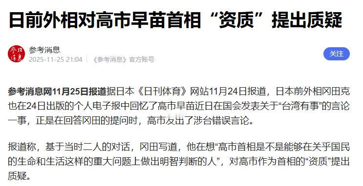 日本前外相“步步为营”,高市早苗首相宝座或“岌岌可危”!据参考消息援引日本《日刊体育》11月24日消息,日本前外相冈田克也表示,他在想“高市首相是不是能够在关乎国民的生命和生活这样的重大问题上做出明智判断的人”,对高市作为首相的“资质”提出质疑。大家发现了吗?11月7日,正是冈田克也向高市提出所谓“台湾有事”在怎样情况下构成“存亡危机事态”,最终让高市发出了涉台错误言论,这叫什么?“请君入瓮”;而在11月18日,冈田克也在接受日本《每日新闻》采访时表示,他在向高市提问后,对方发表的涉台言论与他预想的回答截然相反,令他非常震惊,这叫什么?“落井下石”;11月24日,冈田克也进一步对高市首相的“资质”提出质疑,这叫什么?“穷追猛打”。是不是有“步步为营”的感觉?有时候觉得,日本这些西方国家的政治斗争,比咱们网络上的“宫斗剧”还要精彩!