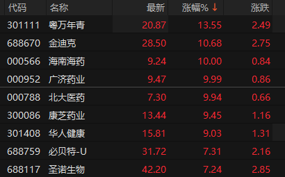 上证报中国证券网讯11月26日早盘,医药生物板块走强,截至9时38分,广济药业3连板,海南海药、北大医药2连板,粤万年青、金迪克涨超10%,康芝药业、华人健康等跟涨。