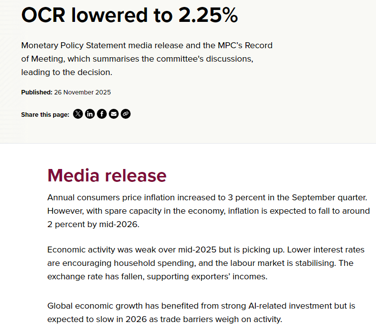 上证报中国证券网讯新西兰央行11月26日宣布,将官方现金利率下调25个基点至2.25%。