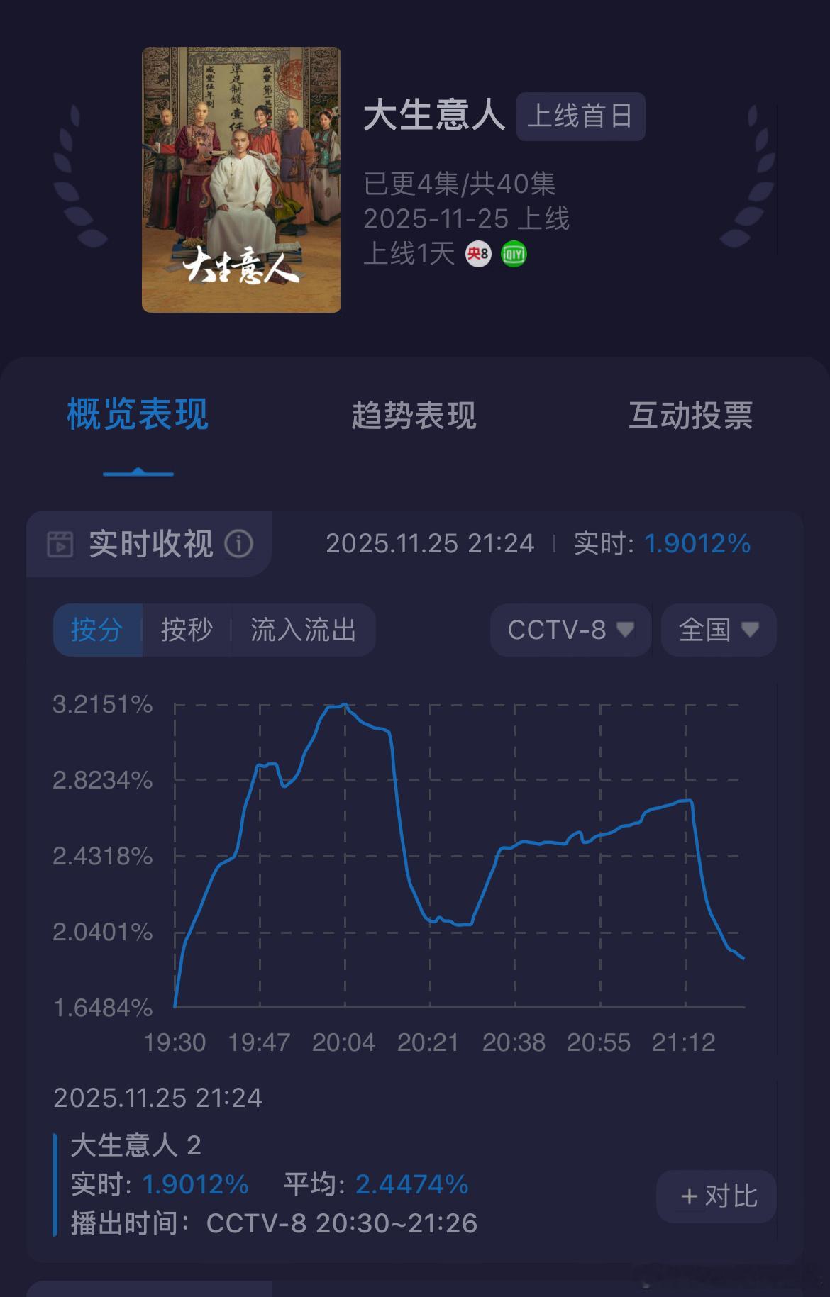 陈晓 首日数据百指4.9w抖指64万V榜57+德塔文1.6+首日酷云收视第一集峰值3.2+,第二集横盘峰值2.6+,1-2集均收视2.5204首日爱奇艺热度6035,实时最高热度6226,预计两云播放量500万上下首日招商6品牌,20广,总时长258s