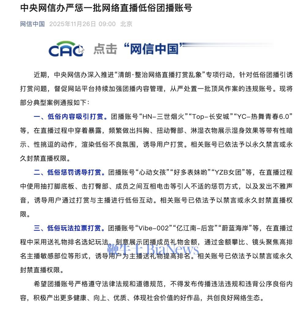 11月26日,网信中国官方表示,近期,中央网信办深入推进“清朗·整治网络直播打赏乱象”专项行动,针对低俗团播引诱打赏问题,督促网站平台持续加强团播内容管理,从严处置一批顶风作案的违规账号。