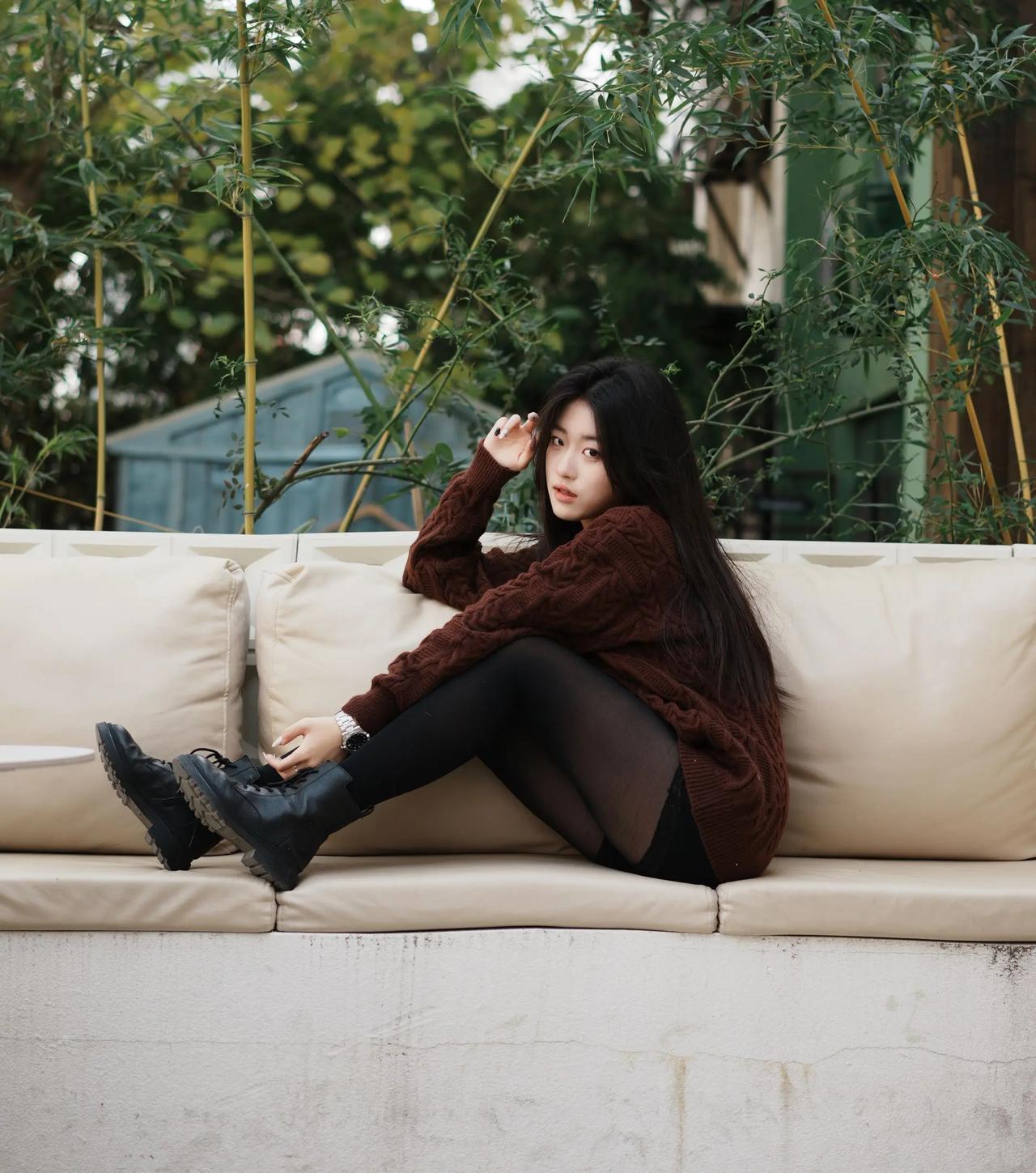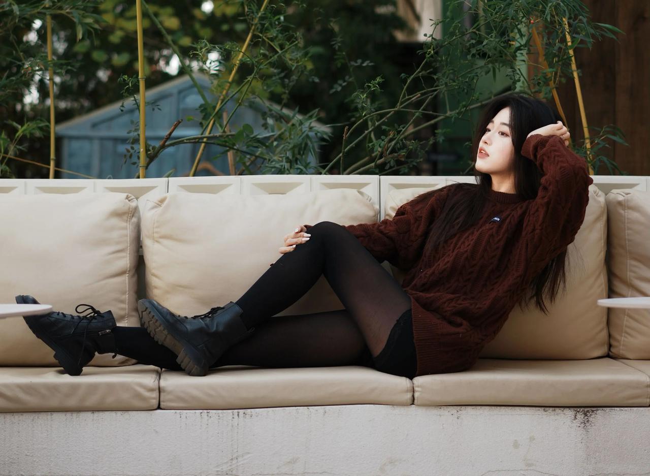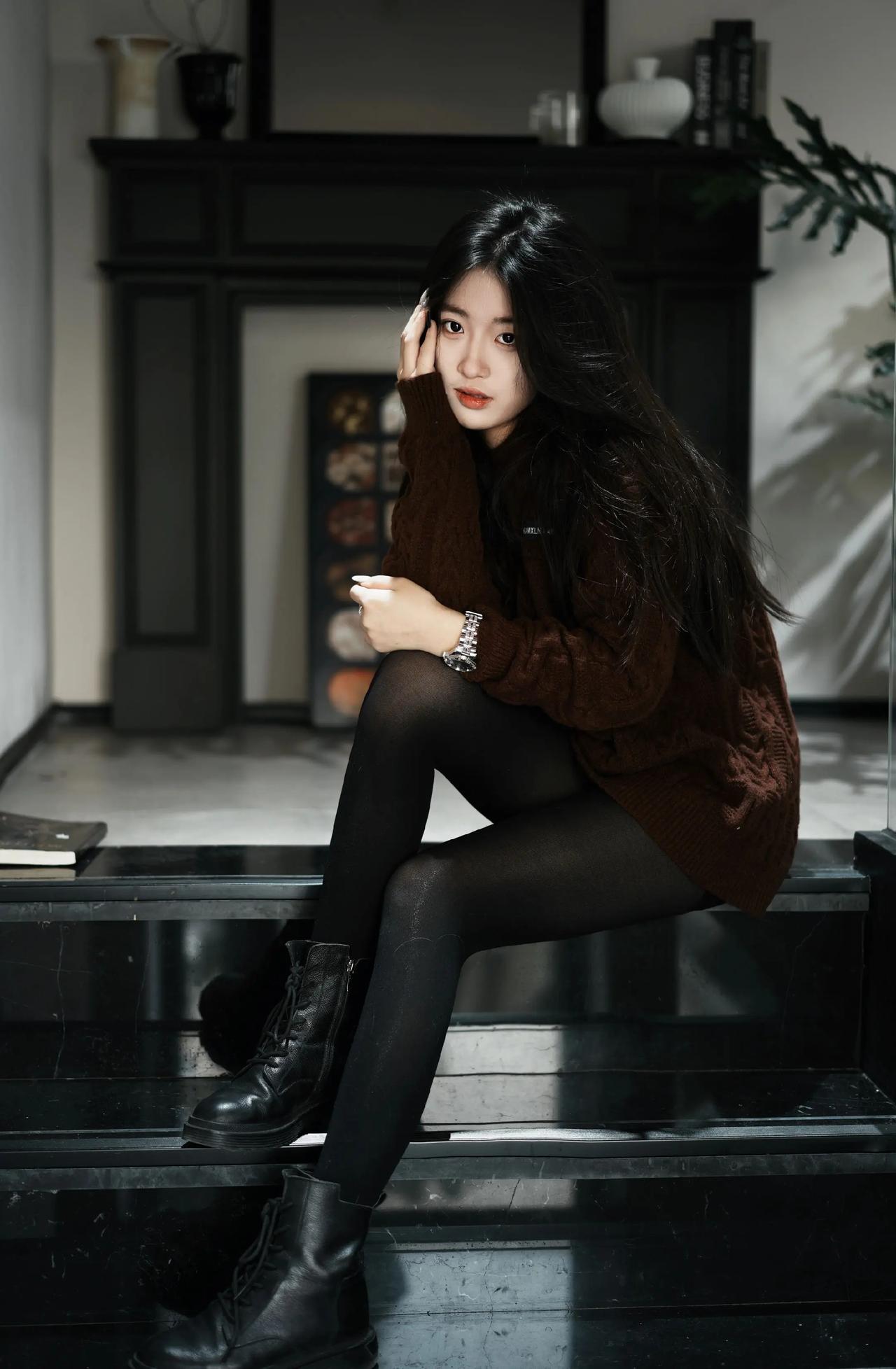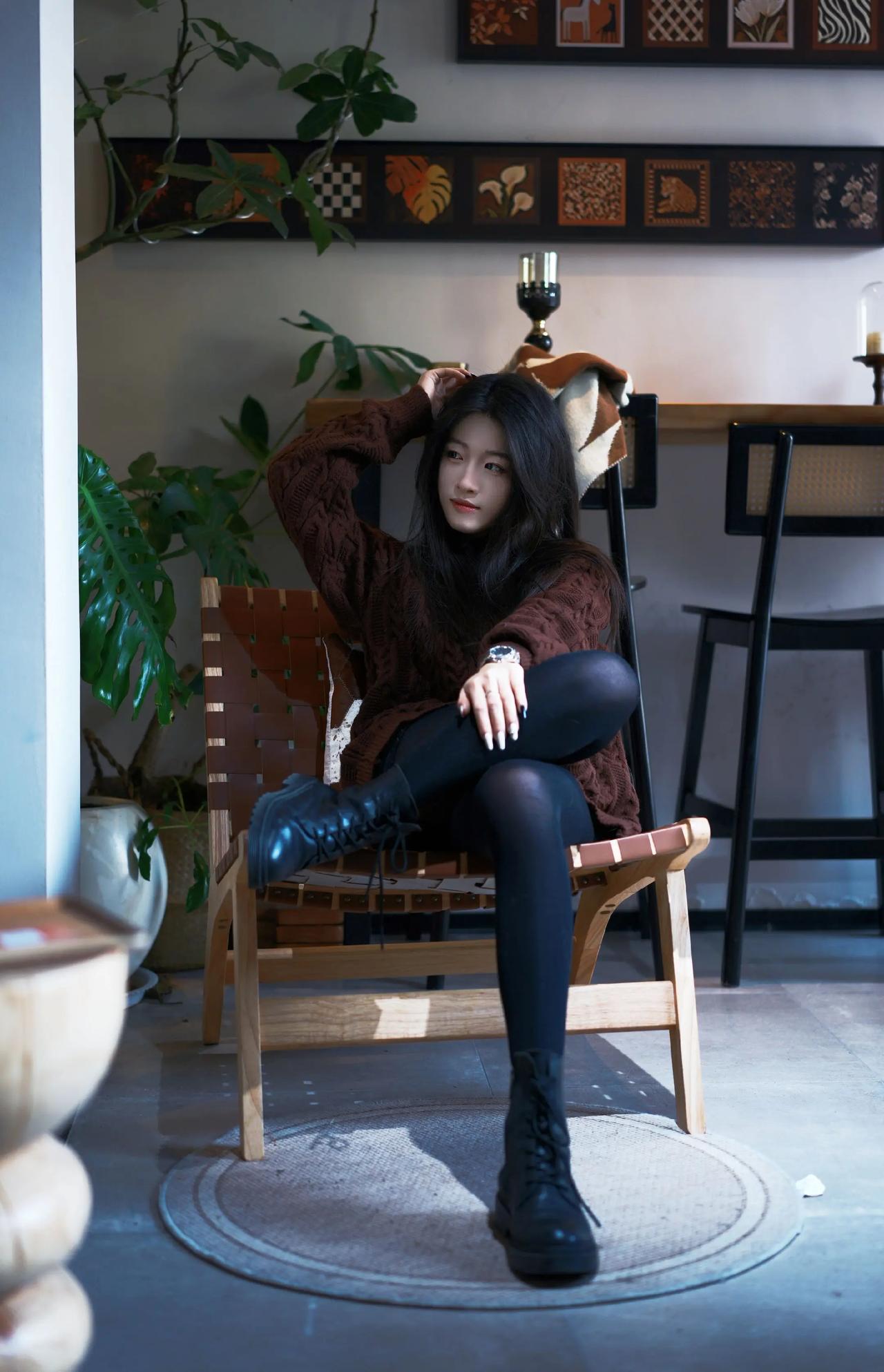 深棕色的粗针织毛衣,搭配黑色丝袜与黑色马丁靴,整体穿搭风格休闲随性又带有些许酷感