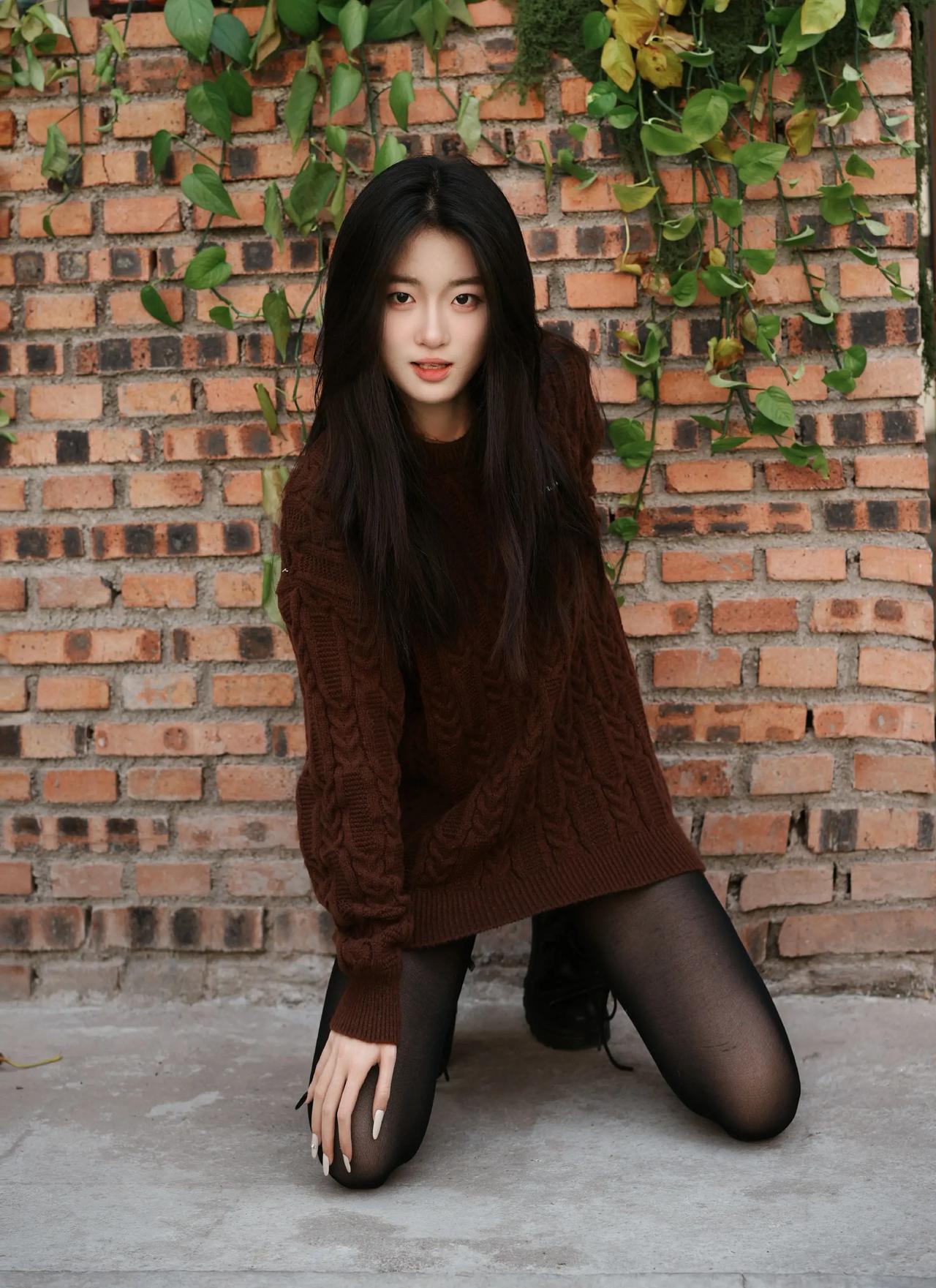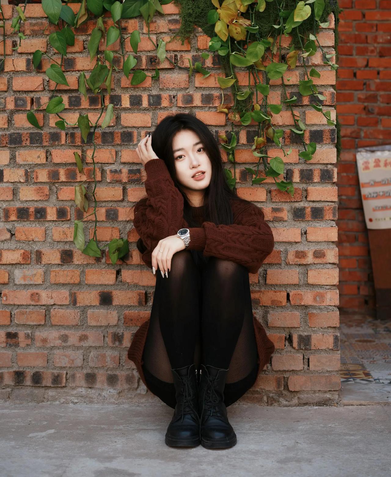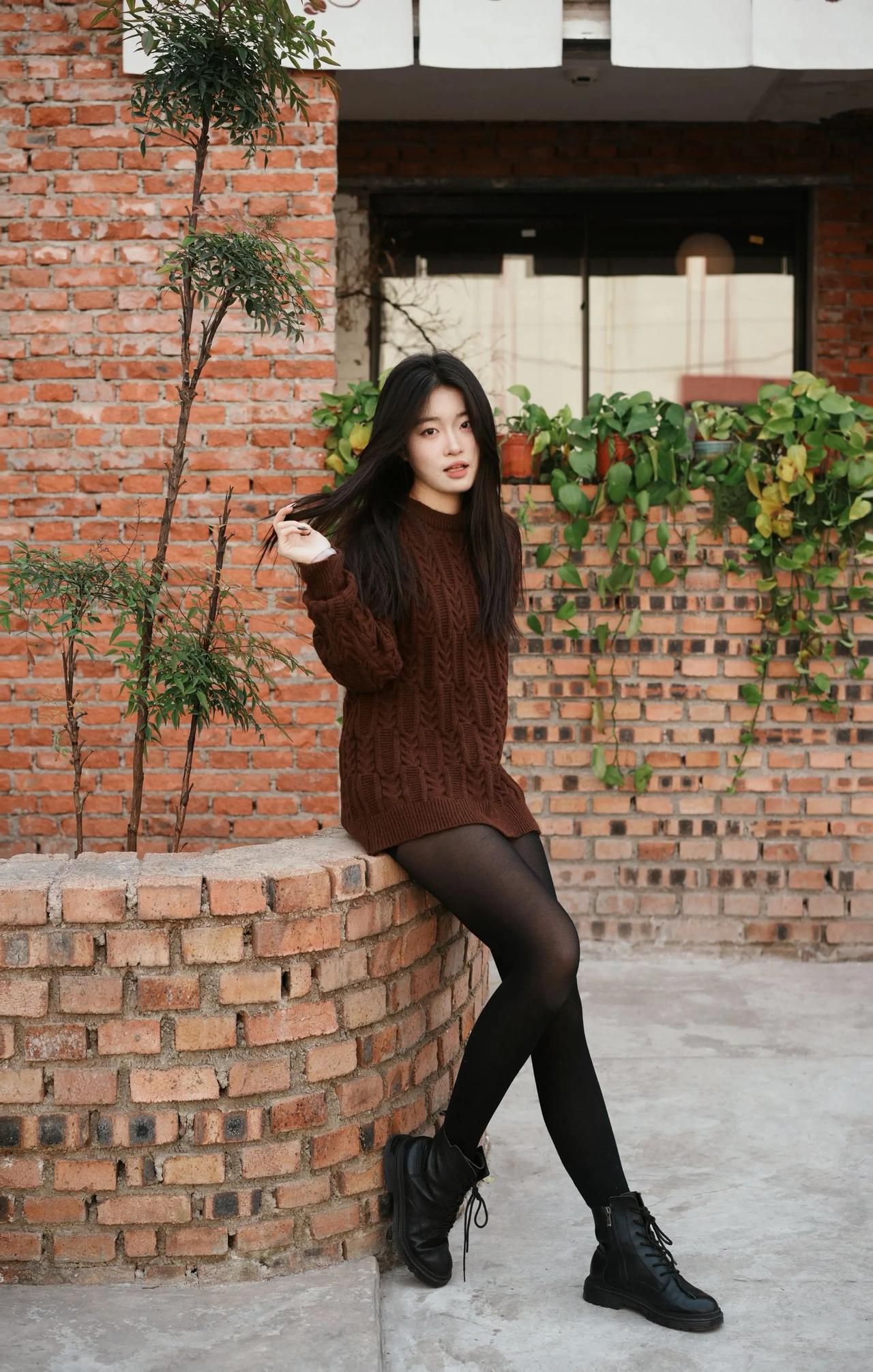 深棕色的粗针织毛衣,搭配黑色丝袜与黑色马丁靴,整体穿搭风格休闲随性又带有些许酷感