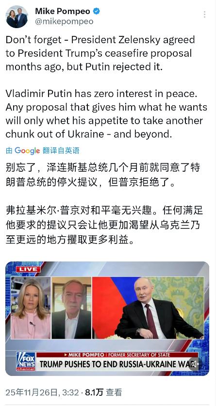 美国前国务卿蓬佩奥北京时间11月26日写道:“别忘了,泽连斯基总统几个月前就同意了特朗普总统的停火提议,但普京拒绝了。弗拉基米尔·普京对和平毫无兴趣。任何满足他要求的提议只会让他更加渴望从乌克兰乃至更远的地方攫取更多利益。”   蓬佩奥在社交媒体上的这番表态,看似在为乌克兰鸣不平,实则暴露了美国政客惯用的叙事套路。这种把复杂地缘政治问题简化为"好人vs坏人"二元对立的话术,在现实国际关系中根本站不住脚。   俄乌冲突爆发以来,双方确实有过多次停火谈判尝试,但每次都因为关键条款分歧而破裂,绝非某一方单方面拒绝那么简单。   2022年3月土耳其伊斯坦布尔谈判期间,俄乌双方其实已经接近达成初步协议。乌克兰方面当时同意保持中立地位,俄罗斯则承诺撤出除克里米亚和顿巴斯以外的军队。   这个草案甚至已经形成了书面文件,但就在签字前夕,英国时任首相约翰逊突然访问基辅,带去了西方国家的"强硬立场",导致谈判戛然而止。   美国智库兰德公司后来发布的报告也证实,北约国家当时确实向乌克兰施压,要求其继续战斗。   蓬佩奥提到的"特朗普停火提议"更是经不起推敲。特朗普在任期间从未提出过任何具体的俄乌和平方案,他只是在竞选演讲中笼统表示"24小时就能结束战争"。   这种空洞口号连基本操作路径都没有,更谈不上得到泽连斯基的正式同意。乌克兰总统办公室2023年多次声明,任何和平方案都必须恢复1991年边界,这个立场从未改变。   美国政客喜欢把普京描绘成"和平破坏者",却刻意忽略北约东扩的历史脉络。从1999年到2020年,北约先后五轮东扩,直接将军事部署推到俄罗斯边境。   美国前驻苏联大使乔治·凯南早在1998年就警告,北约继续东扩是"整个后冷战时代最致命的政策错误"。现在蓬佩奥这些人却把俄罗斯的安全关切完全污名化,这种双重标准实在难以服众。   能源博弈更能说明问题本质。2022年9月北溪管道被炸后,欧洲天然气价格暴涨300%,美国液化天然气出口量却激增150%。   美国能源信息署数据显示,2023年欧洲从美国进口的天然气占总进口量的47%,而战前这个比例不到20%。蓬佩奥作为前国务卿不可能不知道,维持冲突对美国的能源利益多么重要。   军火生意更是明摆着的账。斯德哥尔摩国际和平研究所报告显示,2022年美国军火出口额占全球40%,其中对乌克兰的援助占很大比例。   雷神、洛克希德·马丁这些军工企业的股价在冲突期间平均上涨60%。蓬佩奥本人现在就在这些企业的董事会任职,他批评俄罗斯"攫取利益"时,最好先看看自己的银行账户。   国际社会其实早就看穿这套把戏。2023年联合国大会关于乌克兰问题的表决中,有140多个国家拒绝追随西方立场。   巴西总统卢拉直言:"这场冲突不是今天开始的,它已经持续了很多年。"南非总统拉马福萨则表示:“我们拒绝选边站队,因为非洲深知外部势力干预的后果。”   就连美国盟友也开始唱反调。法国总统马克龙2024年初提出"欧洲战略自主",德国总理朔尔茨则坚持与俄罗斯保持沟通渠道。   匈牙利总理欧尔班更是一针见血:"制裁俄罗斯就像往自己腿上开枪。"这些欧洲领导人的态度转变,说明蓬佩奥的叙事正在失去市场。   从军事角度看,继续冲突对乌克兰越来越不利。乌克兰统计局数据显示,2023年人口流失超过800万,工业产能下降到战前的30%。   西方承诺的F-16战机迟迟不到位,而俄罗斯国防预算今年增长24%。美国国会现在连对乌援助都卡住了,蓬佩奥这时候还在鼓吹"打到底",显然不负责任。   和平谈判其实有现实基础。俄罗斯外长拉夫罗夫2024年多次表示,不拒绝基于现实的谈判。中国提出的十二点和平主张得到巴西、南非等新兴国家支持。就连泽连斯基最近也松口说"可以考虑外交解决方案"。只有美国政客还在不断设置障碍,这种做法才真正"对和平毫无兴趣"。   历史会记住,是谁在延长这场悲剧。蓬佩奥这些人一边发战争财,一边装道德卫士,实在令人作呕。真正的和平需要各方妥协,而不是某一方霸凌。当美国停止向乌克兰输送武器,停止把乌克兰当棋子,和平曙光才会出现。