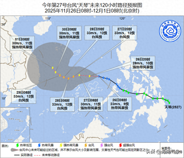 海南省气象局2025年11月26日09时30分继续发布台风四级预警(海上):今年第27号台风“天琴”(热带风暴级),已于今天(26日)凌晨移入南海,08时其中心位于北纬12.6度、东经117.4度,也就是距离海南省三沙市(西沙永兴岛)东南方向约720公里的南海海面上,中心附近最大风力9级(23米/秒)。预计,“天琴”将以25公里左右的时速向偏西方向移动,最强可达台风级(33-38米/秒,12-13级),29日起强度缓慢减弱,之后趋向越南沿海。受“天琴”和冷空气共同影响,26日~28日,南沙、中沙和西沙群岛附近海面风力将逐渐增大到9~10级、阵风11~12级,其中“天琴”中心经过的附近海面,旋转风12~14级;海南岛东部和南部海面,风力6~7级,阵风8~9级;北部湾海面、琼州海峡和海南岛西部海面,风力5~6级,阵风7~8级。请海上作业平台及过往船只继续做好避风措施,请相关部门持续关注海南省气象局最新预报。