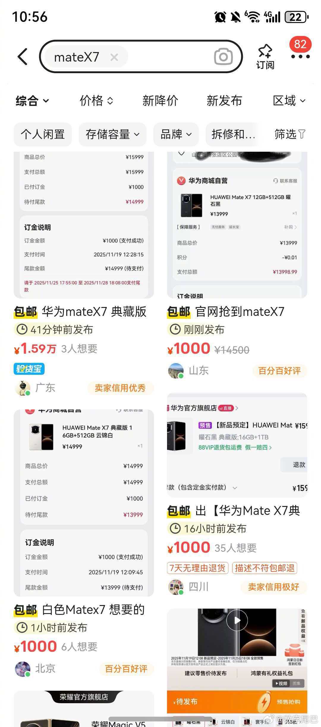刚刚上闲鱼海鲜市场看了一下行情,华为Mate80 RS非凡大师普遍加价800,MateX7典藏版加价1000。上午有没有抢到的朋友