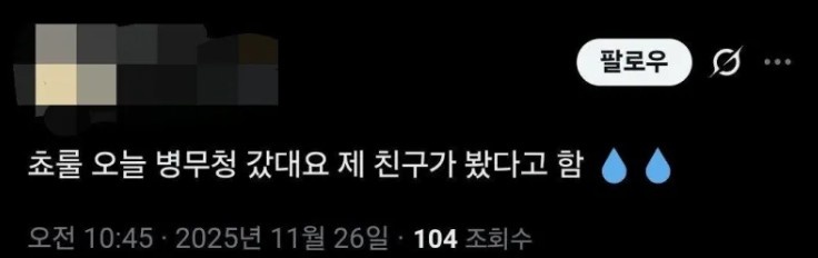 直播吧11月26日讯今日有韩国网友在X上发文:”Chovy和Ruler今天去兵务厅了,我朋友在那儿看见他们俩。"