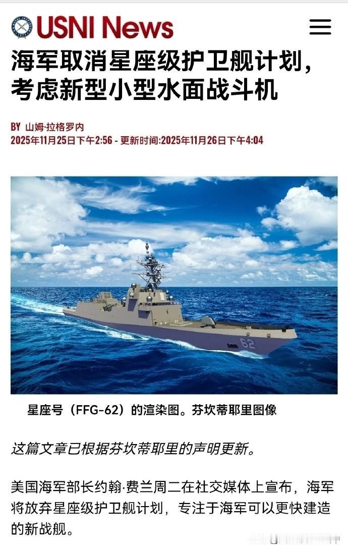 星座级也挂了!不知道美国下一个要取消的项目是什么?F47? 按特佬的喜好,衣阿华级战列舰才够威风凛凛!为什么老美现在造得了万吨级驱逐舰却造不了护卫舰?说好听点,有传承没有创新,说直白点,没有人了! 老伯克,啥都是现成的,工人直接干就行,设计新的,需要预研,立项,配套,最终建造,老美高端人才都去干金融法律医生好莱坞,谁愿意干几万美元一年的纯技术工作? 造点鸭子船吧,混合动力,可搭载4人,战斗力爆表,拥有大型舰船无法比拟的机动优势。