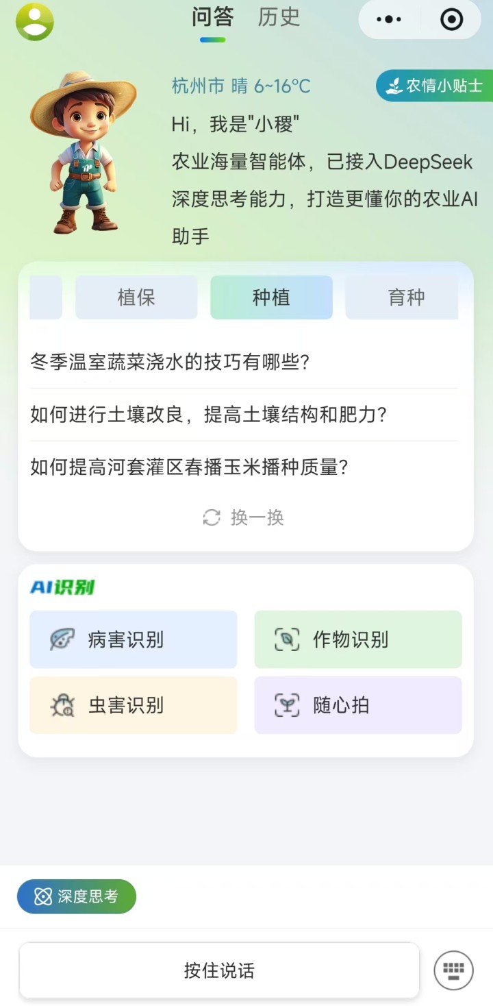 “此外还有AI主动服务,减少决策与学习成本。依托刚刚提到的‘问稷’AI智能体,打造通俗化的种植问答功能,老人通过语音或文字咨询‘植物叶子发黄怎么办’‘多久浇一次水’等问题,系统会用直白的语言给出解决方案,替代专业种植知识的学习。”