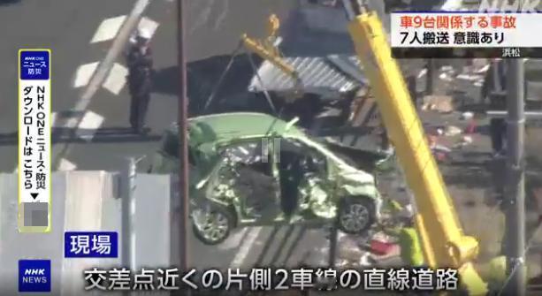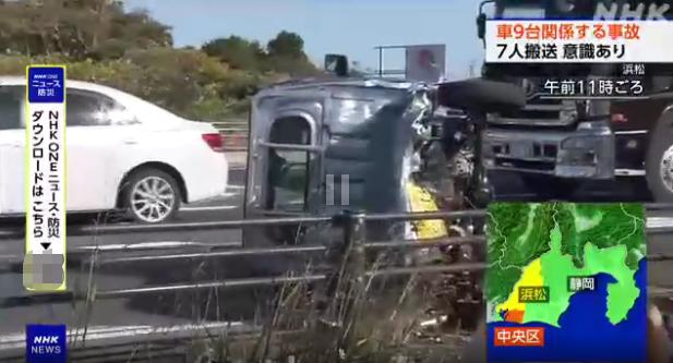 今天早上八点左右,日本静冈县滨松市发生9车连环相撞事故,涉及工程大卡车,家用小轿车,已有7人被紧急送往医院救治。 航拍画面显示,事故现场为一处复杂的交通路段,有主干道,有分叉道,出勤交警描述,是一辆大卡车撞上了前面的车辆,进而发生连环相撞,大卡车车头严重受损,其它车辆不同程度受损,道路护栏严重损坏。