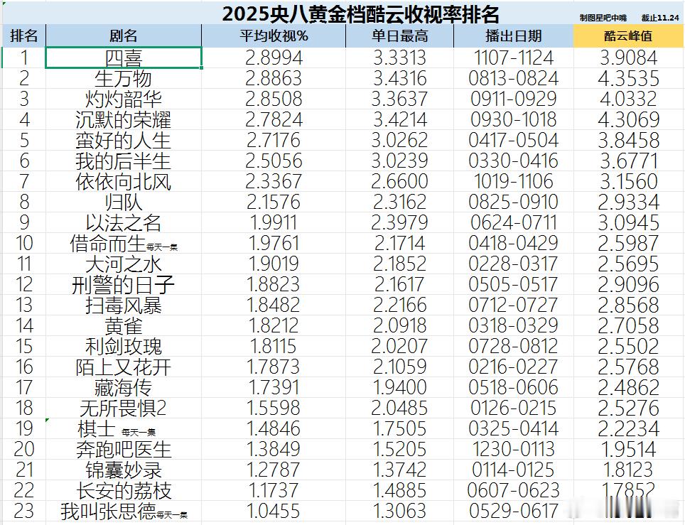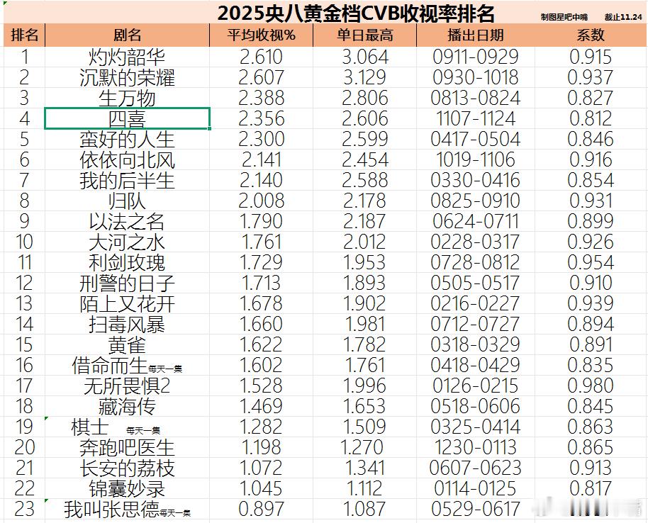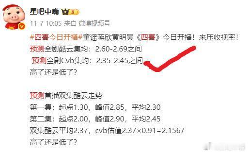 童瑶 蒋欣 黄明昊《四喜》央八收官战报,来看排名。酷云集均:2.8994,暂列年度1/23,史冠。CVB集均:2.356, 暂列年度4/23,史榜6。开播之前预测CVB正确电视剧四喜四喜大结局四喜收视率