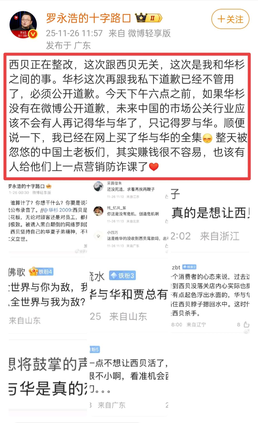 罗永浩怒气冲冲。11月26日上午11点多,罗永浩先生怒火难平,起因是某企业为西贝
