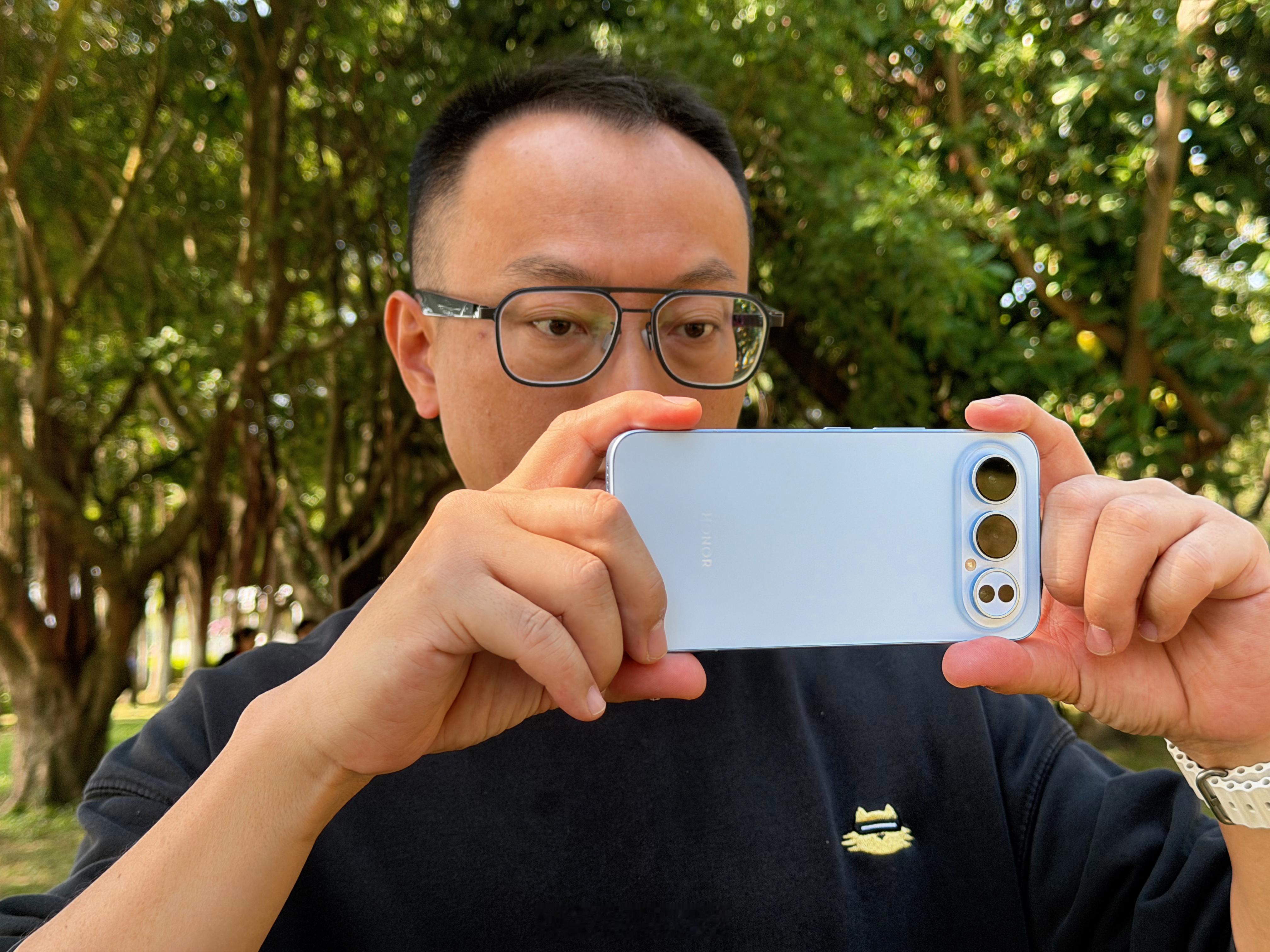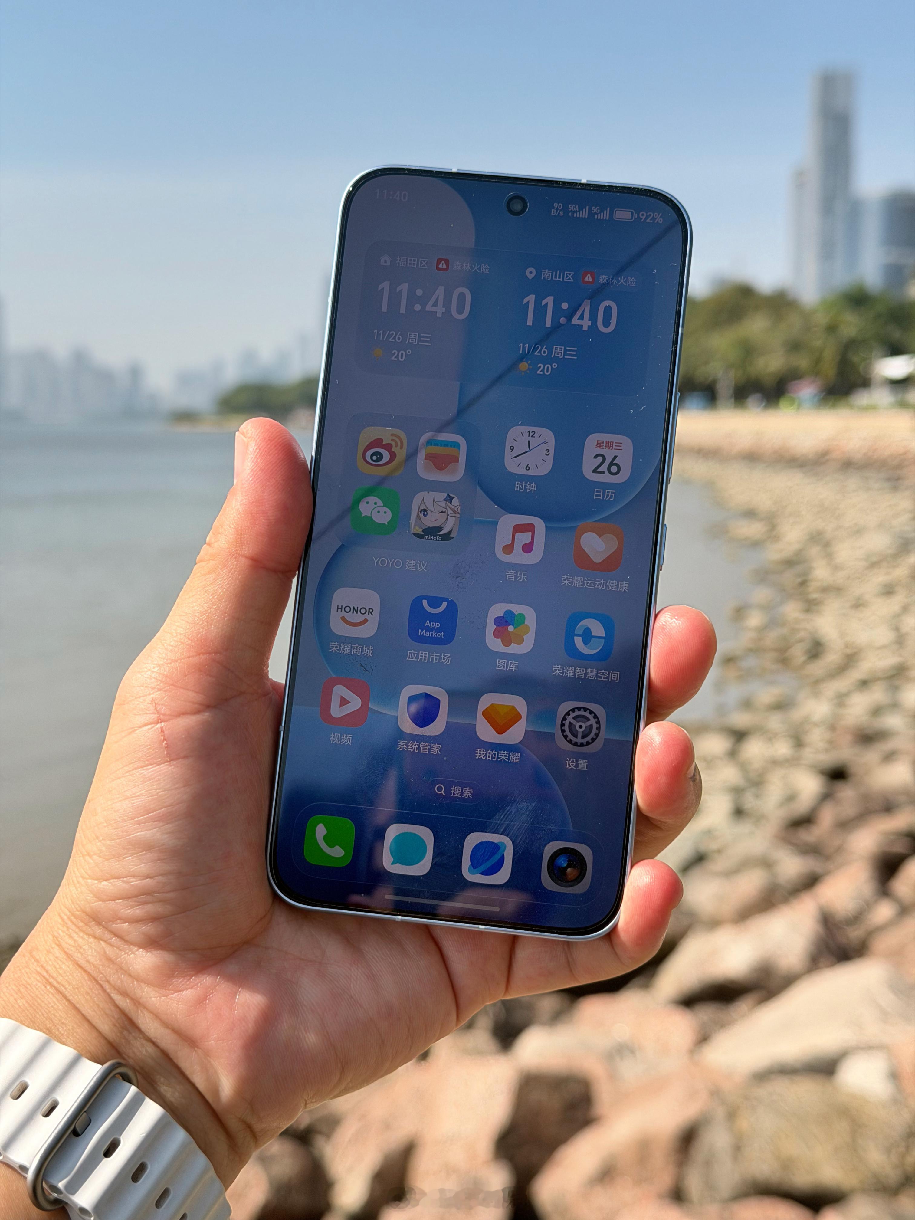 【荣耀500 Pro测评】iPhone Air没搞定的,荣耀500 Pro全都有了!荣耀500 Pro上手的第一印象是“眼前一亮”:横置“水晶岛”镜头模组与一体冷雕工艺背板无缝衔接,金属中框的细腻触感更显高级。机身算是够轻薄的:7.75mm厚、201g重量,实在没想到啊,荣耀给它塞进了8000mAh青海湖电池——这般“轻薄与长续航”的平衡,足以让同档机型汗颜。很多朋友觉得iPhone Air不堪大用的有两点:信号📶,和拍照。其实作为数字系列,荣耀500系列主打一个水桶全能,影像的确是其核心亮点。2亿像素1/1.4英寸大底主摄搭配5000万潜望长焦与1200万超广角,硬件规格直接拉满。实测拍摄主摄成片色彩浓郁且细节锐利,2倍裁切画质仍清晰;长焦在5倍变焦下,借助AI超清算法,建筑纹理分毫毕现。这次荣耀特别优化了“实况照片”:支持前后置美颜虚化,配合6款胶片色彩算法,动态瞬间自带故事感;行业首发的“破框而出”Live特效,通过AI抠图让人物从画面中“跃出”,裸眼3D效果刷爆朋友圈。甚至连路人消除都进化到支持实况照片,一键拯救“废片”的体验太实用了。性能方面,骁龙8 Elite芯片+幻影引擎3.0的组合,《王者荣耀》120帧,《原神》90帧+1.5K画质都是基操了,国产安卓手机在游戏体验已经超越苹果太多身位。而且这个8000mAh电池的续航实力更夸张:早八满电出门,晚八回家仍剩30%电量;80W有线快充30分钟充至54%,50W无线快充+27W反向充电,连iPhone都能当“充电宝”用。屏幕护眼是荣耀的传统强项。1.5K绿洲护眼屏支持3840Hz超高频PWM调光,配合AI离焦护眼、干眼友好等九大技术,长时间刷剧也不易疲劳。超声波指纹解锁更贴心,湿手状态也能秒开。还有MagicOS 10,侧边还有个专属AI物理按键一键唤醒YOYO智能体,“YOYO看见”能识别食物卡路里、商品链接,“YOYO记忆”自动整理屏幕关键信息;跨生态互联更支持与苹果设备文件互传、消息同步,双持党福音。总结来看,荣耀这次又要热卖了,从影像到续航,从性能到AI,荣耀500 Pro用“无短板”的全能表现,重新定义了中端机的体验上限。若你追求一部“什么都能做好”的手机,它绝对是今年最值得考虑的选择。荣耀500发布会
