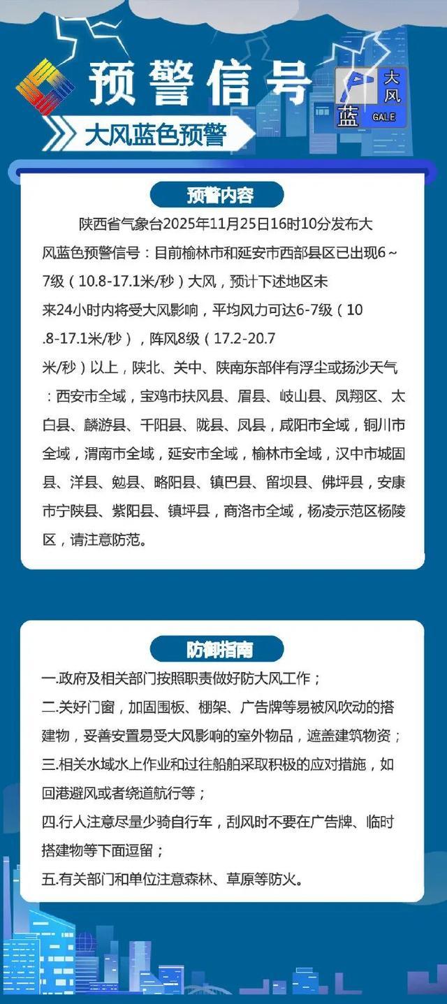 目前榆林市和延安市西部县区已出现6~7级(10.8-17.1米/秒)大风,预计下述地区未来24小时内将受大风影响,平均风力可达6-7级(10.8-17.1米/秒),阵风8级(17.2-20.7米/秒)以上,陕北、关中、陕南东部伴有浮尘或扬沙天气:西安市全域,宝鸡市扶风县、眉县、岐山县、凤翔区、太白县、麟游县、千阳县、陇县、凤县,咸阳市全域,铜川市全域,渭南市全域,延安市全域,榆林市全域,汉中市城固县、洋县、勉县、略阳县、镇巴县、留坝县、佛坪县,安康市宁陕县、紫阳县、镇坪县,商洛市全域,杨凌示范区杨陵区,请注意防范。