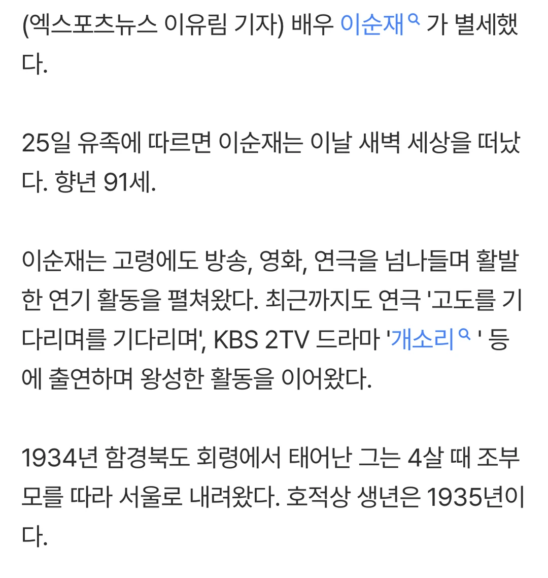 据遗属25日透露,李顺载当天凌晨离开了人世。 享年91岁。