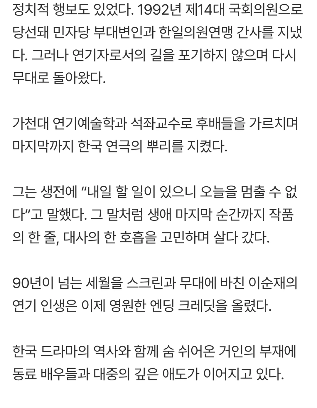 将90多年的岁月奉献给银幕和舞台的李顺载的演技人生,如今终于迎来了永远的结尾。