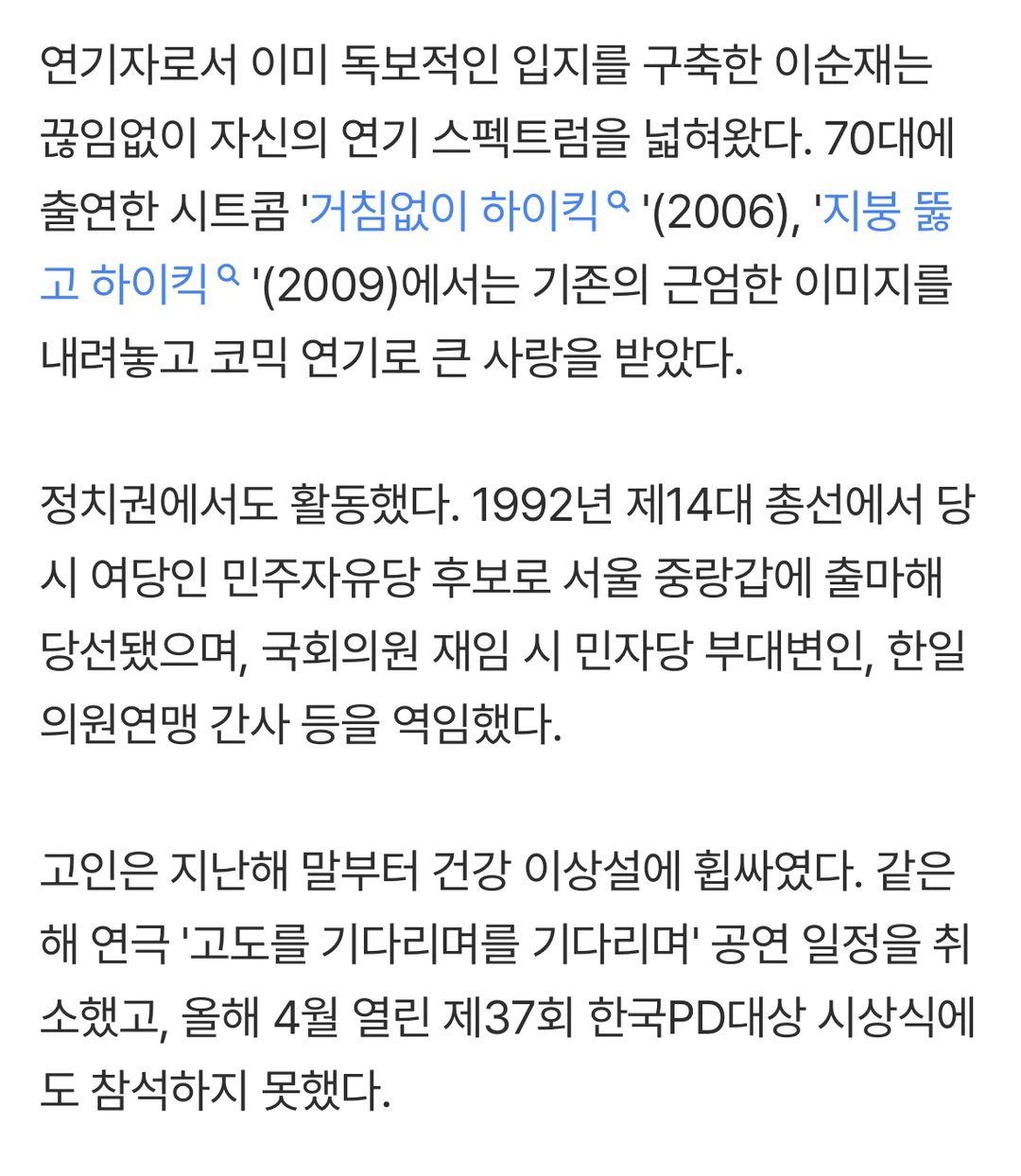 故人从去年年末开始就传出了健康出现异常的传闻。 同年取消了话剧《等待戈多》的演出日程,今年4月举行的第37届韩国PD大奖颁奖典礼也未能参加。