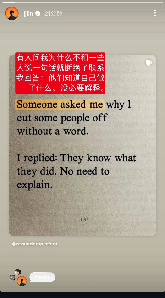 林俊杰回应恋情:“有人问我为什么不和一些人说一句话就断绝了联系。我回答:他们知道自己做了什么。没必要解释。”