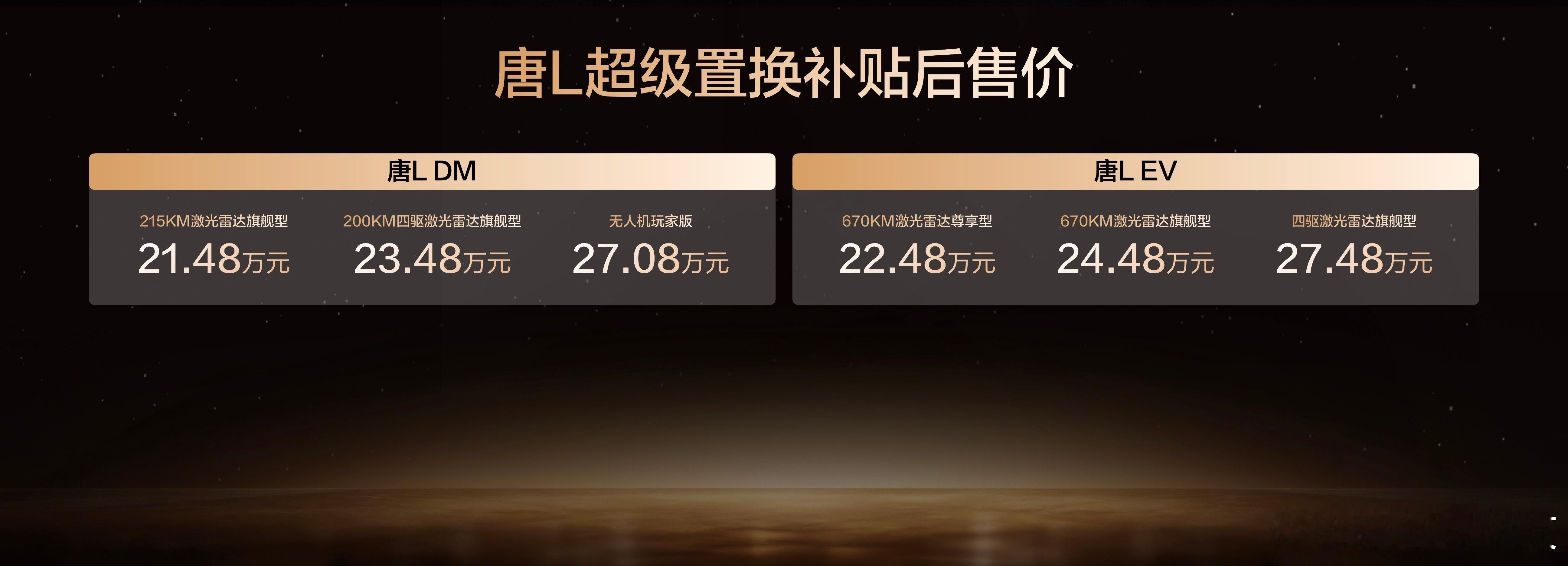 这是一个迟来的报道~比亚迪汉L、唐L正式发布,补贴后售价19.48万元起,享至高5.2万元尊享礼遇,带来“科技满配颜值翻倍”的全面进阶。纯电版搭全域千伏架构,5分钟补能400公里、零百加速最快2.7秒;混动版用第五代DM技术,亏电油耗最低3.9L/100km、综合续航1430km。新车新增橄榄绿,汉L额外添西子蓝车色,还通过OTA升级DiLink智能座舱与“车位到车位”领航辅助,并联动美的等品牌构建“人×车×家”生态,打造兼具实力与美感的出行选择,咋样盆友们?