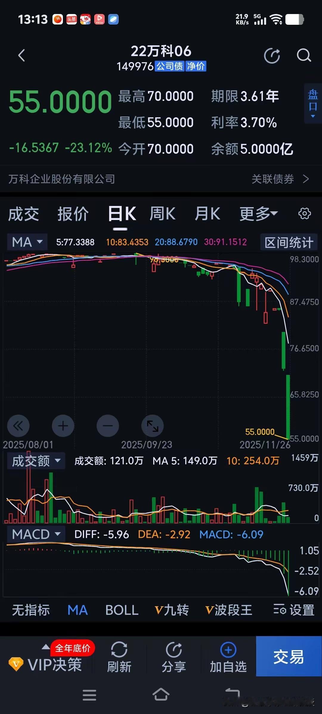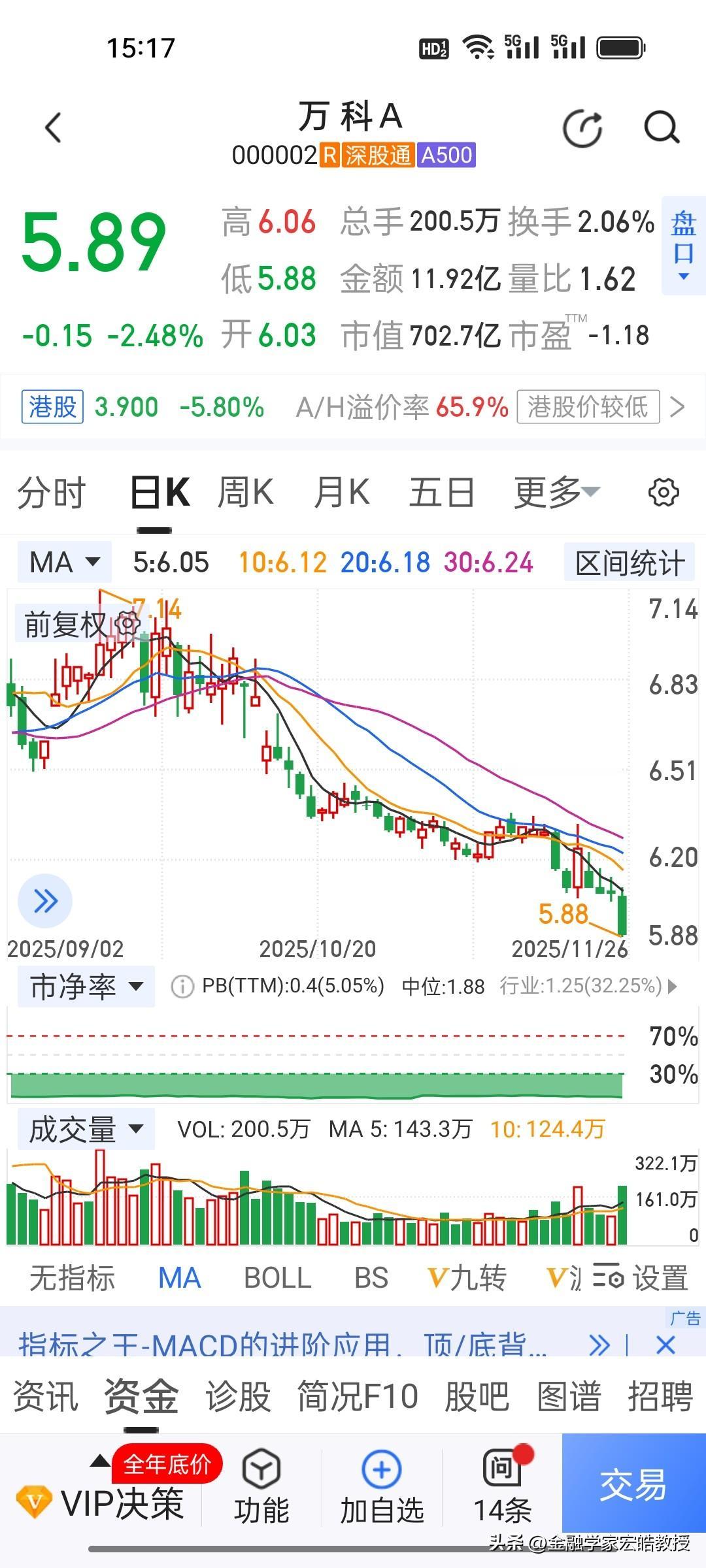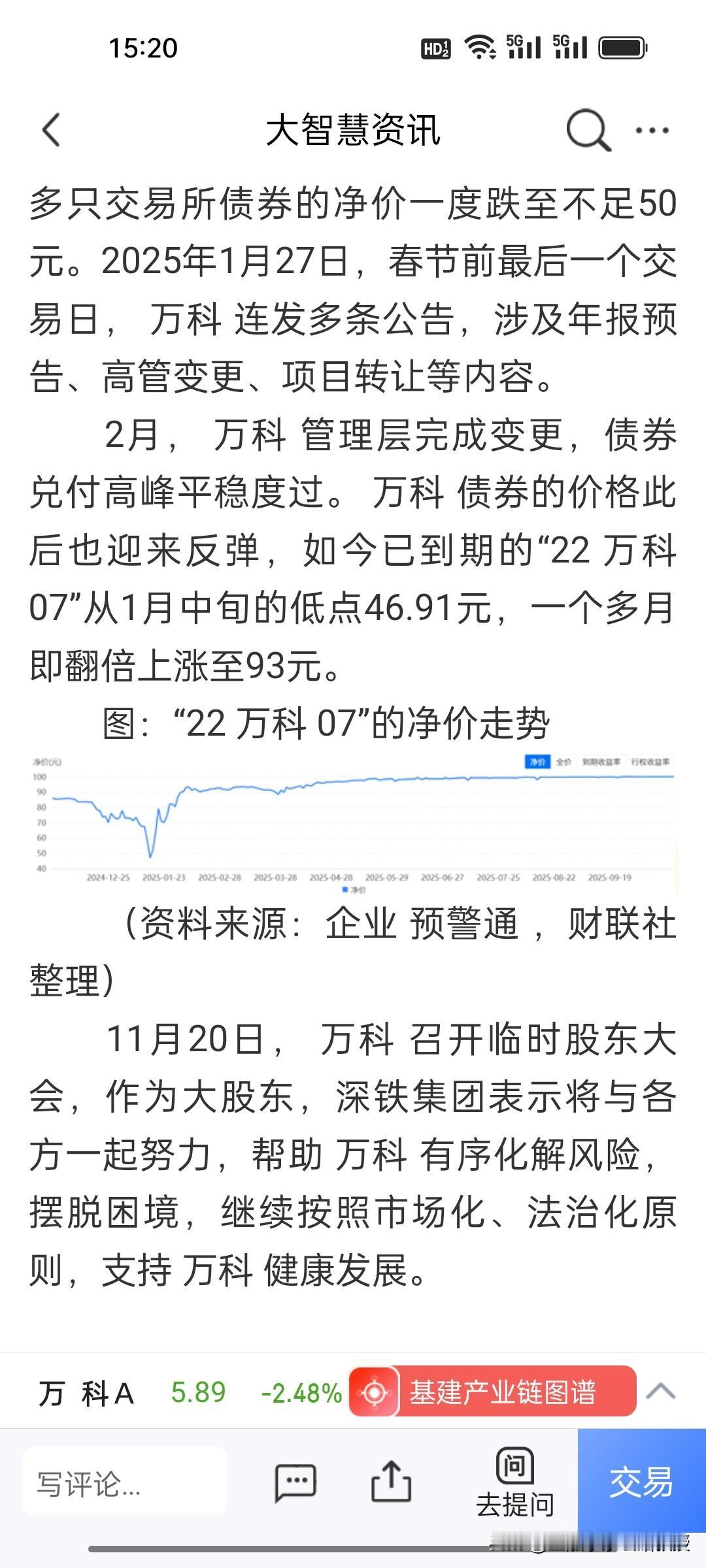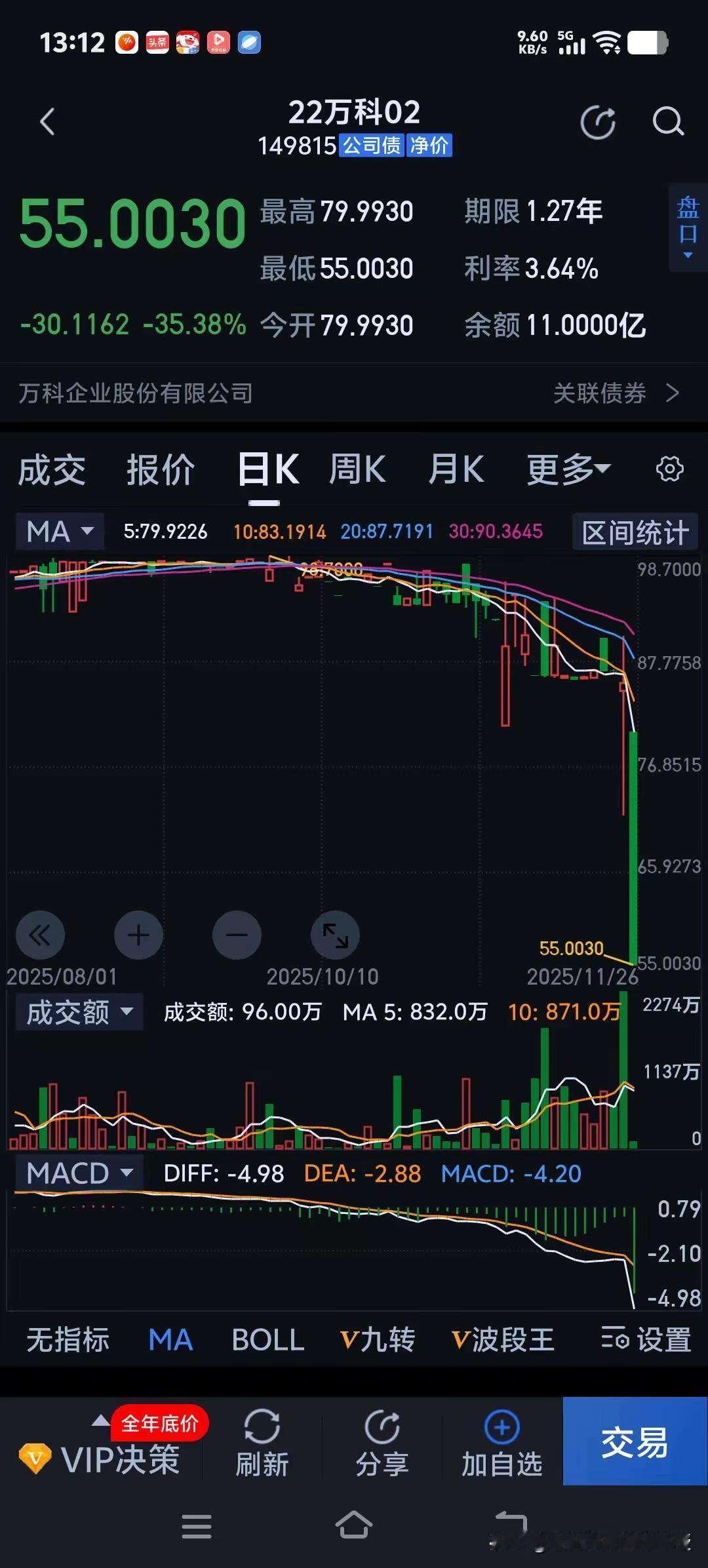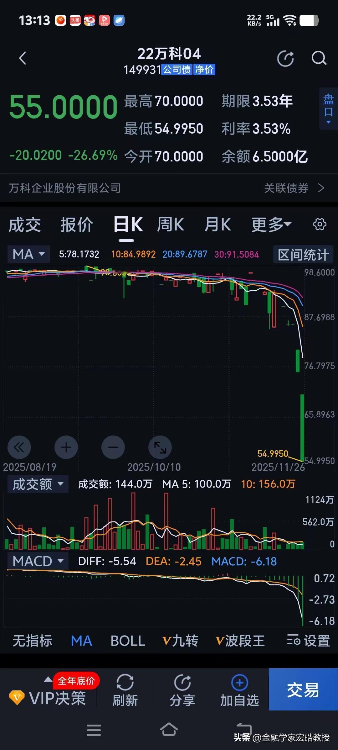 突发!在没有明确“黑天鹅”的情况下,万科连续两日债券大跌,今天更是多只跌破20%触发临停,一起带崩的还有万科的股价,今天已经创下了一年内新低,深铁集团五天前还表示一定会帮助万科渡过难关,摆脱困境,眼下最棘手的就是万科在12月有57亿元中票即将到期,这对深铁集团来说应该不是什么难题。 我认为万科这个时候应该要出来澄清说明一下,以免再次出现股债双杀的局面,这对万科的50万中小投资者来说,这种罕见的双跌局面出现在年底,确实有些不寻常。