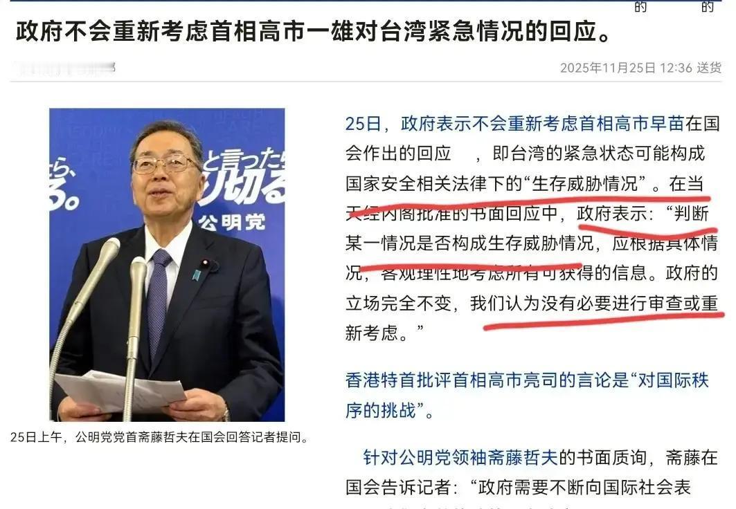日本政府再次出来表态立场,嘴依旧非常的硬! 11月25日,日本政府声称,政府表示不会重新考虑首相高市早苗在国会作出的回应,在当天经内阁批准的书面回应中,日本政府也表示,政府的立场完全不变! 这份文件是内阁集体拍板的,里面说得明明白白,绝不重新考虑首相高市早苗在国会上的那些表态,立场半分不动。 更值得琢磨的是,就在这份回应出来前,美日两国领导人刚通完电话,可日本却始终没收回高市那些出格话。 这到底安的什么心,估计不少人都在犯嘀咕,日本为啥非得在台海问题上跳出来刷存在感?它嘴里的“存立危机”,真能站得住脚吗? 日本敢这么硬气,头一个原因就是想死死抱住美国的大腿,这些年美国一直在亚太搞“印太战略”,正缺日本这么个“前哨”。 日本刚好借着这个由头,把台海问题和自己的安全绑在一起,它抛出“存立危机”这套说法。 说白了就是想让美国觉得,日本的安全跟台海紧紧挂钩,这样才能让美国松口,允许它进一步放开军事限制。 要知道日本和平宪法本来是管着它军事行动的,可这些年它一直找各种借口突破。 根据日本防卫省公布的数据,2023年它的防卫预算创下历史新高,比上一年涨了快三成,这背后要是没有美国默许根本不可能。 所以这次借着台海话题发声,本质上就是日本给美国表忠心,换一张未来可能出兵的“许可证”。 除了抱美国大腿,国内的政治小算盘也是重要原因。高市早苗本身就是日本右翼的头面人物,支持她的大多是对现状不满的保守派。 现在日本经济情况可不太好,日元一个劲贬值,物价涨得老百姓都快扛不住了,抱怨声特别多。 这种时候把矛头指向中国,炒作台海话题,既能讨好比翼右翼选民,又能把大家的注意力从国内经济问题上引开,帮自己稳住政治地位。 日本共同社就统计过,高市早苗说完那番涉台言论后,她所在政党的支持率短期内涨了2个百分点。 别看这数字不大,在选情胶着的时候,这点涨幅可能就决定成败,用外交话题转移国内矛盾,这在日本政坛早就不是新鲜事了。 往更深了挖,这背后还有日本藏不住的历史野心,从明治维新那会儿开始,日本对外扩张的心思就没断过,这种念头到现在也没真正压下去。 故意把“存立危机事态”的定义搞模糊,就是为了将来干预台海留个法律空子,按日本现在的说法,只要它自己觉得台湾的事威胁到它了,就有理由动军事力量。 这逻辑是不是听着耳熟?二战前日本就是拿“保护侨民”当借口侵略别的国家,现在这套说辞换汤不换药。 国内军事专家就点破了,要是日本真把这话落到实处,相当于在东亚埋了颗定时炸弹。以后台海这边稍有动静,它就可能借着这个由头出兵,到时候地区和平稳定就全被打破了。 日本真敢动手吗?答案是大概率不会,但咱们也不能掉以轻心,日本虽说军费涨了不少,可短板特别明显。 它的军工体系全靠美国技术撑着,关键武器的零件大多得从美国买,真要是打起来,根本耗不起。 而且日本国内反对战争的人也不少,11月26号东京就有上千人上街集会,抗议政府在台海问题上挑事,喊着“别把日本拖进战争”。 经济上它更不敢赌,海关总署的数据摆着呢,中国是日本最大的贸易伙伴,日本的汽车、电子产品,一大半都要靠中国市场。 真要是因为台海问题闹僵了,日本经济肯定得遭重,这点日本商界看得门儿清,最近不少大企业都在给政府施压,让它别搞事,维持对华关系稳定。 反倒日本自己的“硬气”开始坑自己了,不少中国消费者对日本品牌的好感度降了,一些日本的美妆、母婴牌子在国内销量都下滑了,这就是市场给它的教训。 面对日本这种挑衅,咱们的应对既有力又稳当,除了外交部直接硬刚,咱们还拿出了联合国“敌国条款”这个法律武器。 二战后联合国的相关决议写得很清楚,日本是“敌国”,军事发展要受限制,它现在这些做法,根本就是违背战后国际秩序。 咱们把这些历史文件和法律依据摆出来,就是要让全世界看明白日本的真面目,让它在国际上没理可讲。 与此同时,解放军在台海周边的常态化演训一直没停过,航母编队、战斗机群正常战备巡航,这就是对外部势力最实在的威慑,用实力告诉日本,台湾是中国的家务事,外人别想插一杠子。 日本就是把台湾当成实现自己野心的棋子,可它忘了,台湾不是随便能摆弄的玩意儿,中国更不是好惹的。 高市早苗这帮人觉得说几句硬话就能刷存在感、绑住美国,却没想想这么做只会让日本越来越孤立。 日本在台海问题上硬撑,本质上就是跟历史潮流对着干,既得不到国际社会支持,还得损害自己利益,跳得越高,摔得越重,这道理日本要是拎不清,早晚得栽跟头。 大家觉得日本这种“嘴硬”能撑多久?面对外部势力在台海问题上的挑衅,咱们该保持怎样的心态?