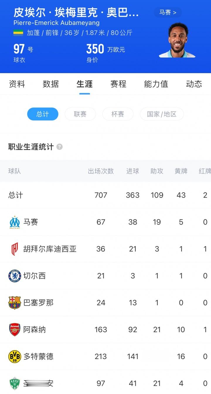 今夏回归马赛后,奥巴梅扬本赛季16场比赛已经贡献了8球7助攻。目前36岁的奥巴梅扬德转身价为350万欧元,而在2018年巅峰时期,效力于阿森纳的奥巴梅扬身价最高曾达到7500万欧元。