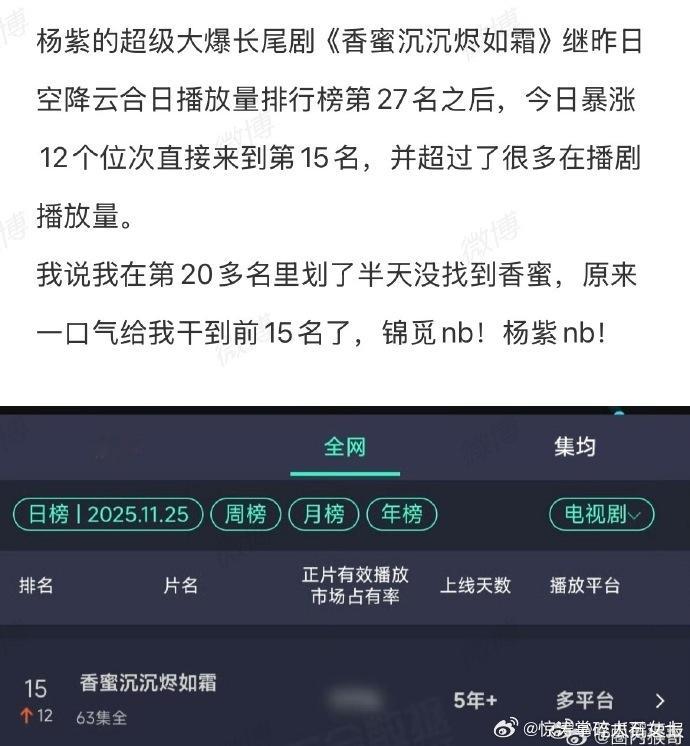杨紫香蜜云合上升至第15名杨紫香蜜云合上升12位杨紫《香蜜》热度回春!云合上升 12 位至第 15 名,实景特效与扎实剧情,经得起时间考验。