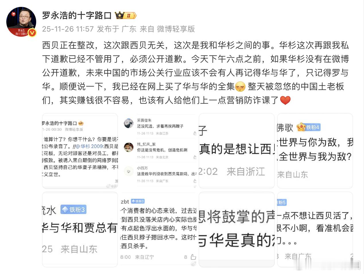 华杉账号开启防护模式华杉微博设置无法关注罗永浩 华杉这次被老罗集中火力了,不针对西贝,就针对华与华了(老罗:西贝正在整改,这次跟西贝无关,这次是我和华杉之间的事)华与华创始人微博开启了一键防护模式,已无法关注。