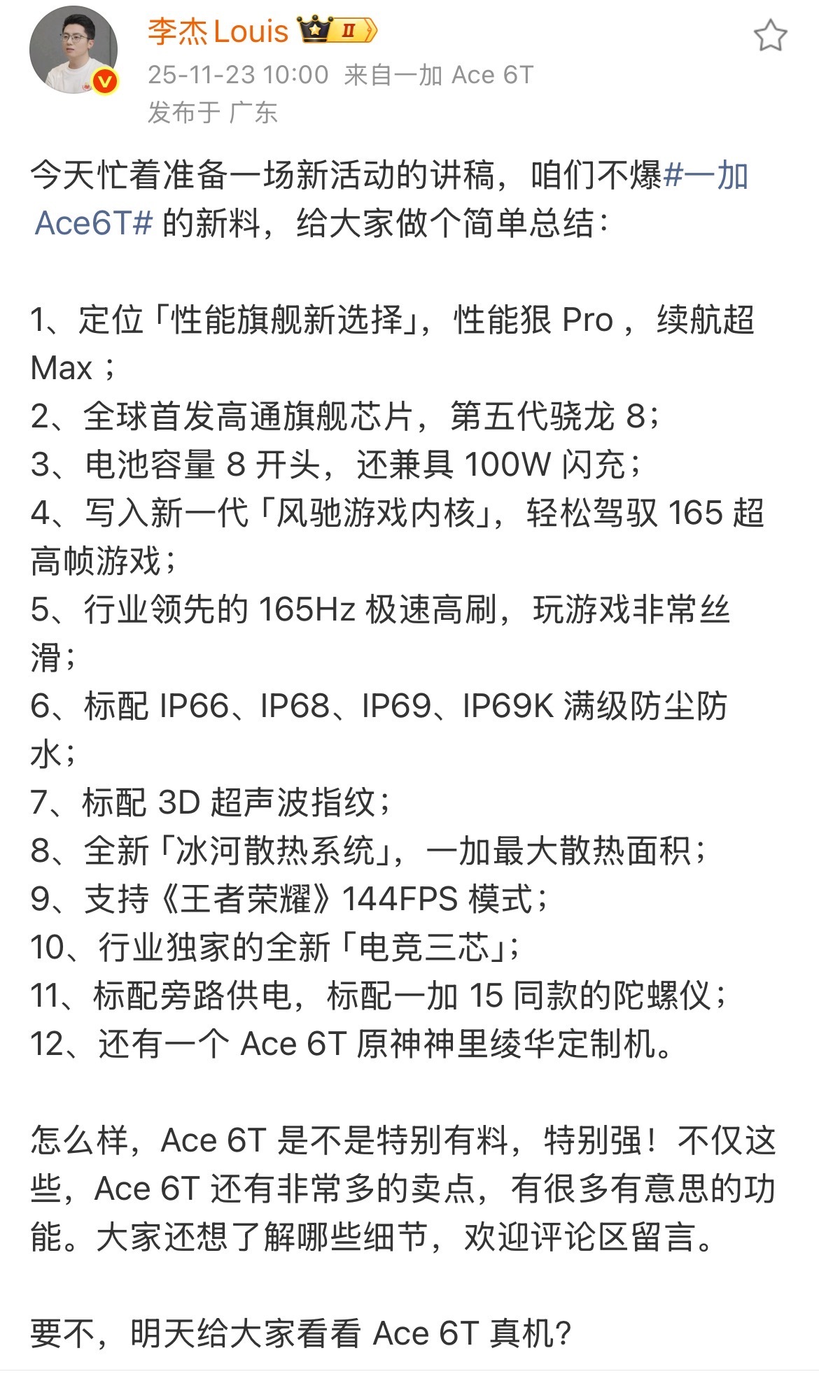 一加Ace6T首发第五代骁龙8 看完骁龙8 Gen5的发布会我可以直接说一加Ac