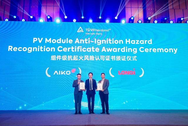 此外,在峰会首日的晚宴活动上,TÜV莱茵还向爱旭、隆基颁发了“组件级抗起火风险”认可证书。近年来,随着光伏电站规模增加,电站起火事故频频发生,对用户生命财产安全构成威胁。为此,TÜV莱茵针对实际应用场景需求,设计了组件级抗起火风险认可标准和测试规范,测试结果显示,BC组件在高温、遮挡环境下拥有更低的表面温度,在防起火性能上具备独特优势,可以更好地保障电站运行安全。