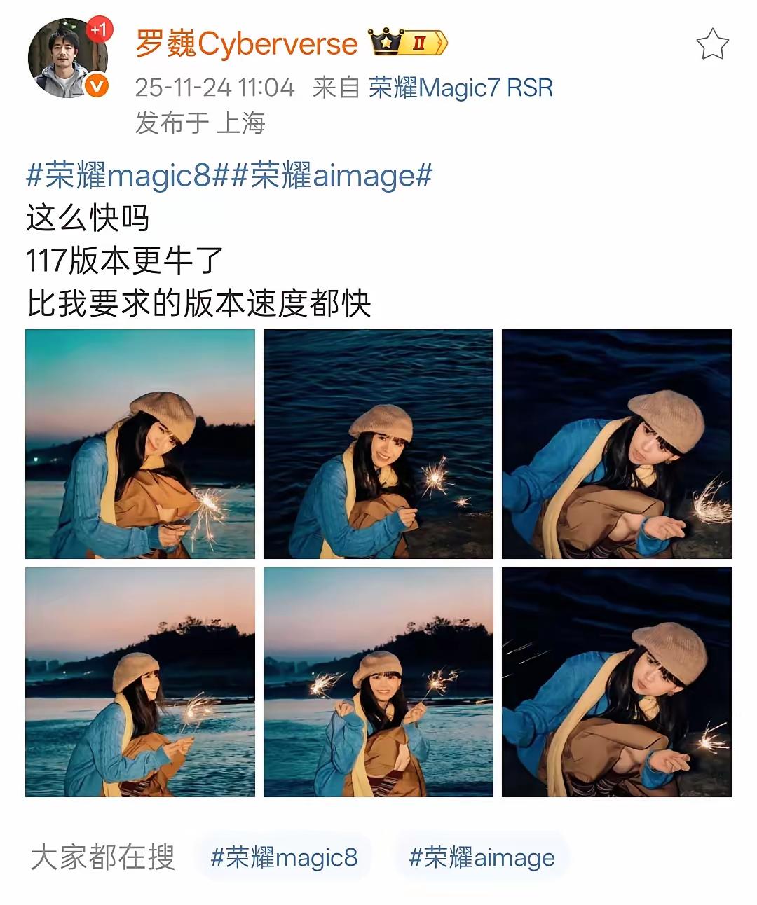 荣耀MagicOS10的116版本很多功能我还玩不透,117版本就要来了。刚看到荣耀首席影像罗巍分享这个消息,友商看来恐怕要炸锅了,从分享样张来看人像和夜景都比116版有提升。Magic8系列影像从发布后大家实际使用情况,得到大家一致好评。 之前罗巍就表示过,荣耀Magic8系列的影像系统将会是一周一更,目前来看没有食言。