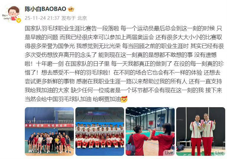 中国羽毛球队陈清晨发文告别国家队,结束国家队生涯。她在文中坦言“能征战两届奥运会