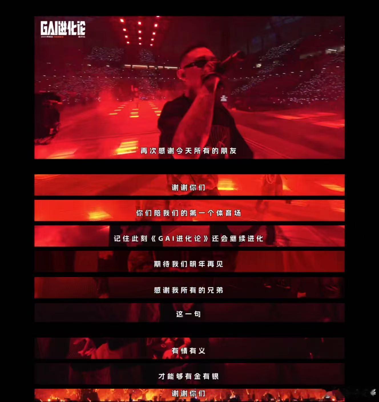 GAI演唱会还没戒断又续上了 看完重庆特别限定场的幕后纪录片,真的是彻底被GAI的真诚和努力打动了!每一句话都能感受到他对音乐的热爱和对粉丝的珍惜,真的好想再听他唱,江湖再见快点见!