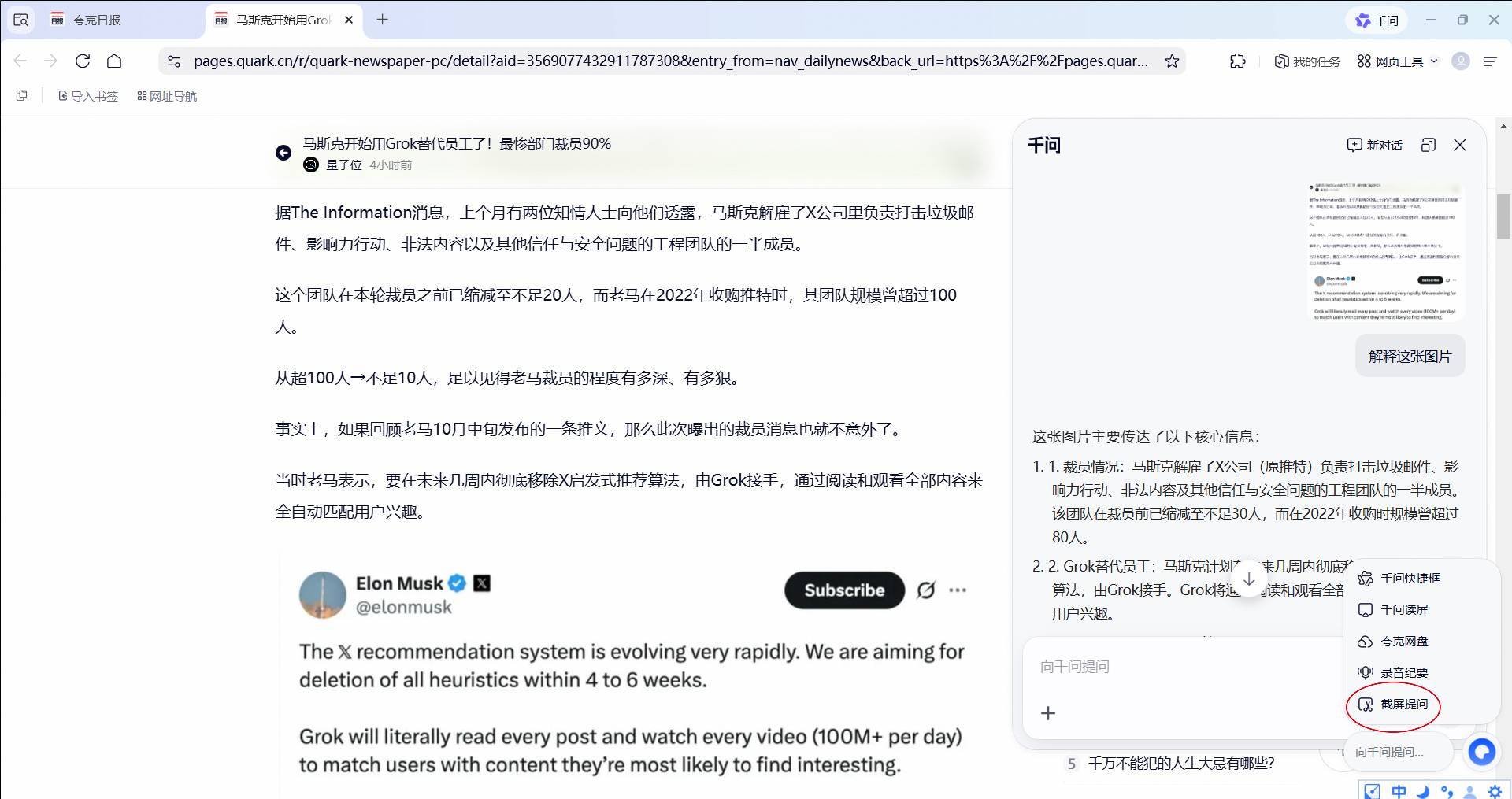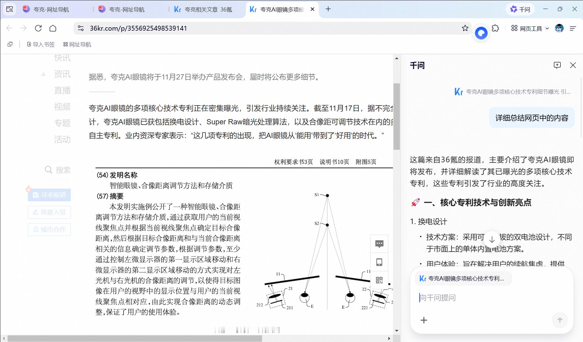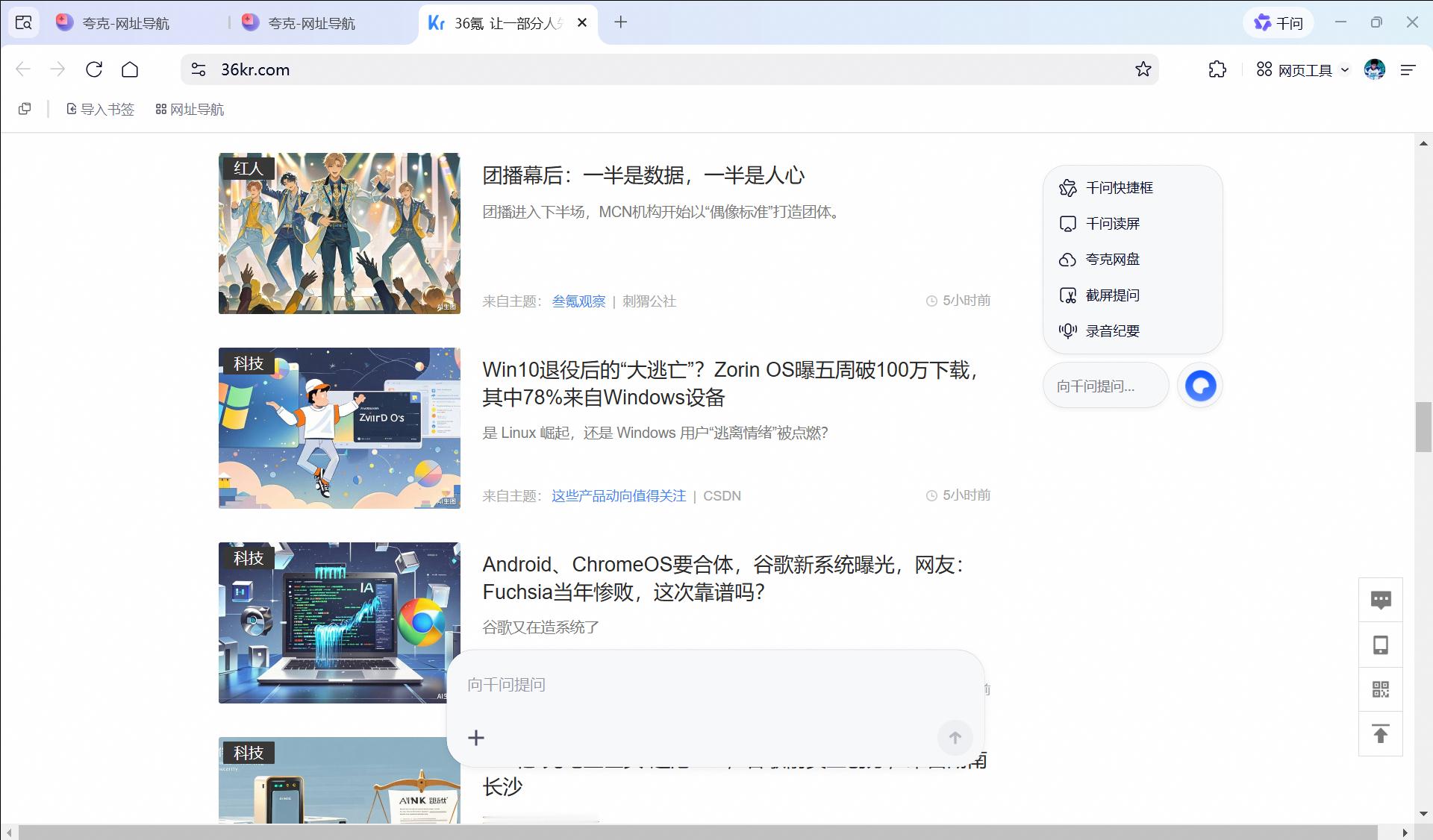 对标Chrome的夸克AI浏览器免费用刚刚夸克发布全新AI浏览器,全面融合千问,推出千问智能套件,让用户无需切换应用和标签,就能召唤千问AI来完成任务。浏览器本来就是使用频率最高、入口地位最稳的工具。现在夸克将AI作为AI浏览器的底座,将AI与浏览体验融为一体 =入口之王重新当选。这不是夸克新产品上线,这是入口权争夺战打响。AI浏览器会成为下一代超级入口,已经没有悬念。据知情人爆料,夸克AI浏览器在电脑上的安装量高达1.1亿。既有的用户基础+先进的产品形态+全免费无广告的体验,夸克在占领用户工作流上的优势明显。