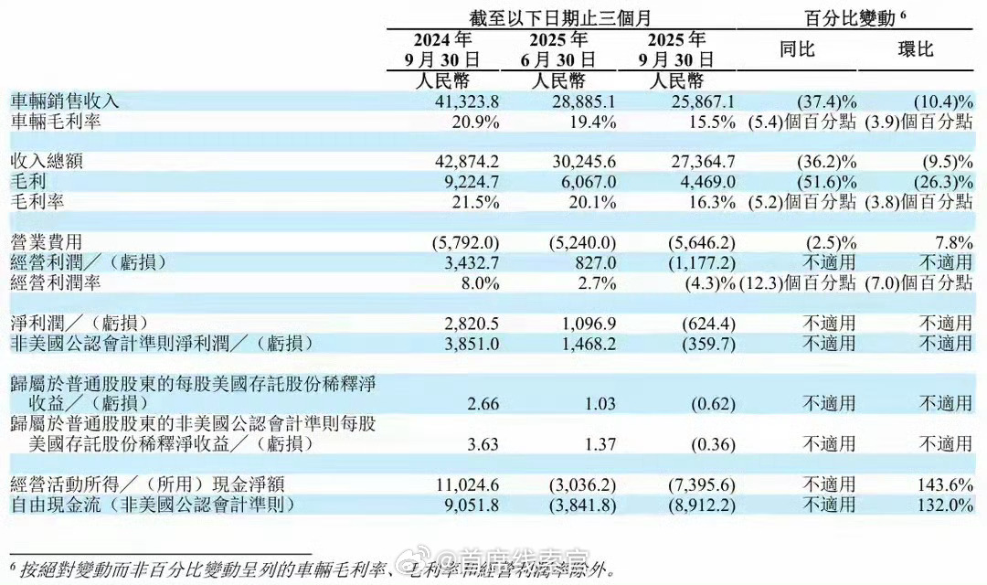 理想汽车第三季度财务业绩:-第三季度营收为 274 亿元,今年前三季度营收 835 亿元;-第三季度研发费用达 30 亿元,预计全年研发总额达到 120 亿元,其中人工智能领域投入超过 60 亿元,芯片、基座模型、底层操作系统、核心控制器等领域全面深入自研,构建面向未来的技术护城河;-AI 投入持续加速理想辅助驾驶技术迭代,三季度,理想 VLA 司机大模型实现量产上车,月度使用率提升至 91%,用户渗透率行业领先;-纯电布局在三季度取得关键突破,理想 i8 与理想 i6 两款纯电 SUV 累计订单已突破 10 万辆,产业链伙伴正协力加速产能扩充。理想汽车发布25年Q3财报308_IO新能源汽车