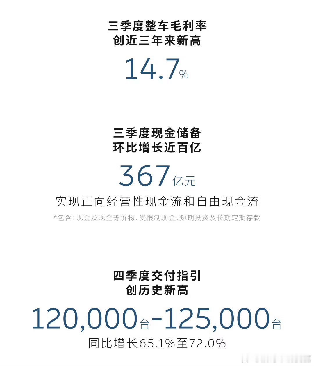 蔚来汽车蔚来2025年三季度财报 蔚来Q3财报,各方面指数超出预期。亏损收窄至34.8亿元,同比减少31.2%,环比下降30.3%。Q3总收入218亿,创历史新高,毛利润为人民币30.246亿元,同比增长50.7%。汽车销售额192亿元,同比增长15.0%,汽车毛利率14.7%。另外大家关心的现金储备:三季度达到了367亿,实现正向经营性现金流。蔚来预测,预计2025年第四季度的汽车交付量将在120,000辆至125,000辆之间。