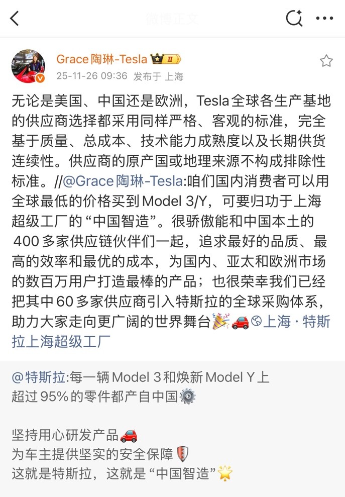 针对近期市场关于“特斯拉要求供应商在北美制造环节排除中国零部件”的传闻,11月26日,特斯拉副总裁陶琳发文表示:无论是美国、中国还是欧洲,特斯拉全球各生产基地的供应商选择都采用同样严格、客观的标准,完全基于质量、总成本、技术能力成熟度以及长期供货的连续性,供应商的原产国或地理来源不构成排除性标准。