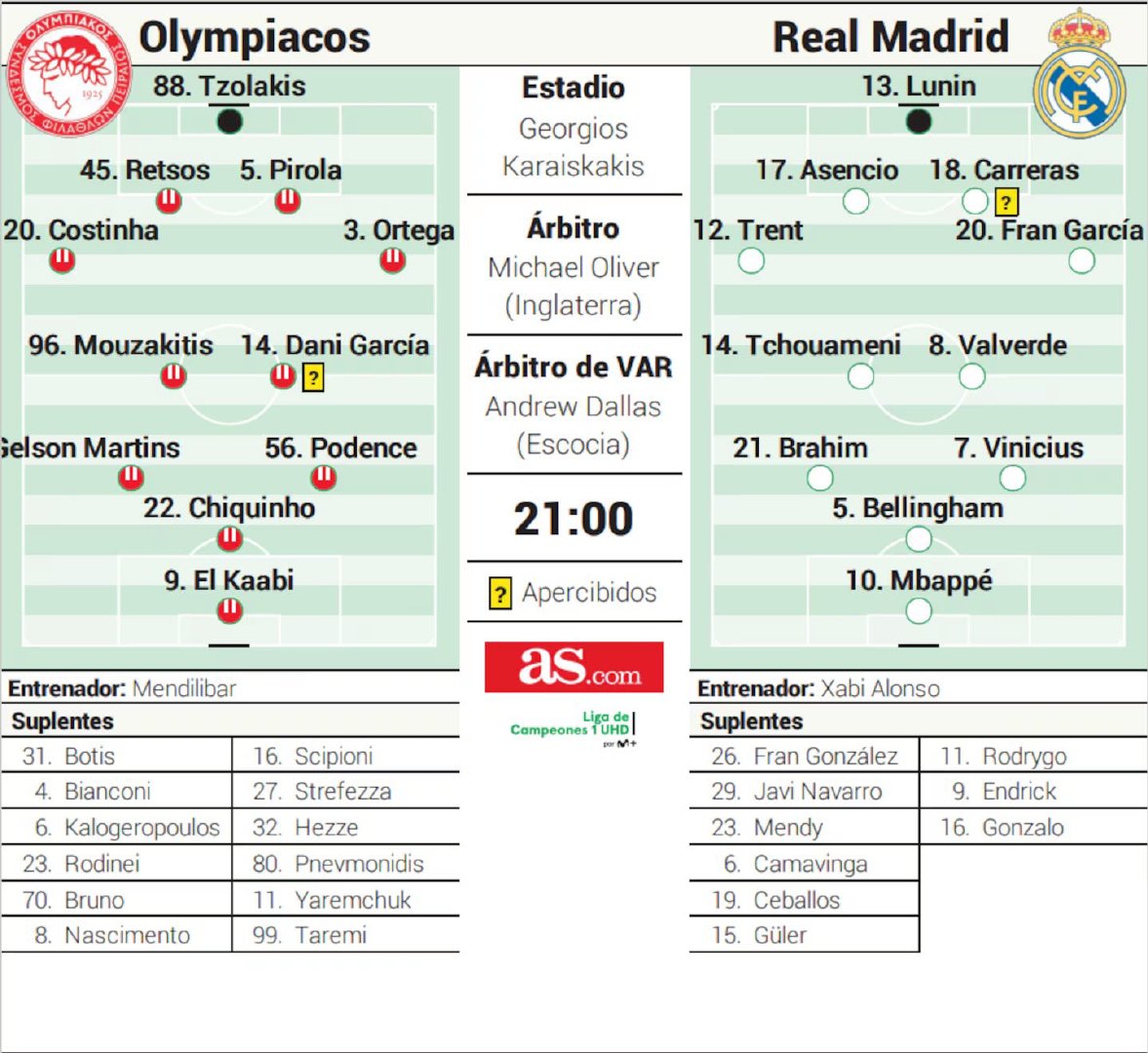 马卡阿斯预测皇马首发。欧冠联赛奥林匹亚科斯vs皇马