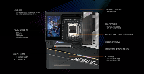 个性化与实用性兼备,主板正面配备5英寸EdgeViewLCD屏幕,玩家可自定义显示内容彰显个性。背部I/O接口丰富全面,包含双USB4端口(最高40Gbps,视CPU而定)、USB-C20Gbps/10Gbps端口各一、八个USB-A10Gbps端口、HDMI接口及音频插孔,前置USB-C20Gbps端口进一步拓展连接便利性,全方位覆盖各类外设接入需求。