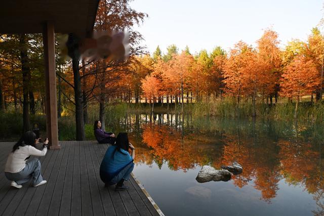 记者在现场看到,这里是上海中心城区罕见的杉林湿地景观。约10.7公顷的区域内,池杉、水杉、中山杉、东方杉等3500余株杉类植物高耸入云,其中近三分之一的树木直接生长在水中。眼下正值深秋初冬观赏期,红褐色的树冠与碧绿的水面交相辉映,偶尔还能看到几只小䴙䴘在水面徜徉,白鹭轻盈掠过树影婆娑的水面,一派生机盎然的自然野趣。